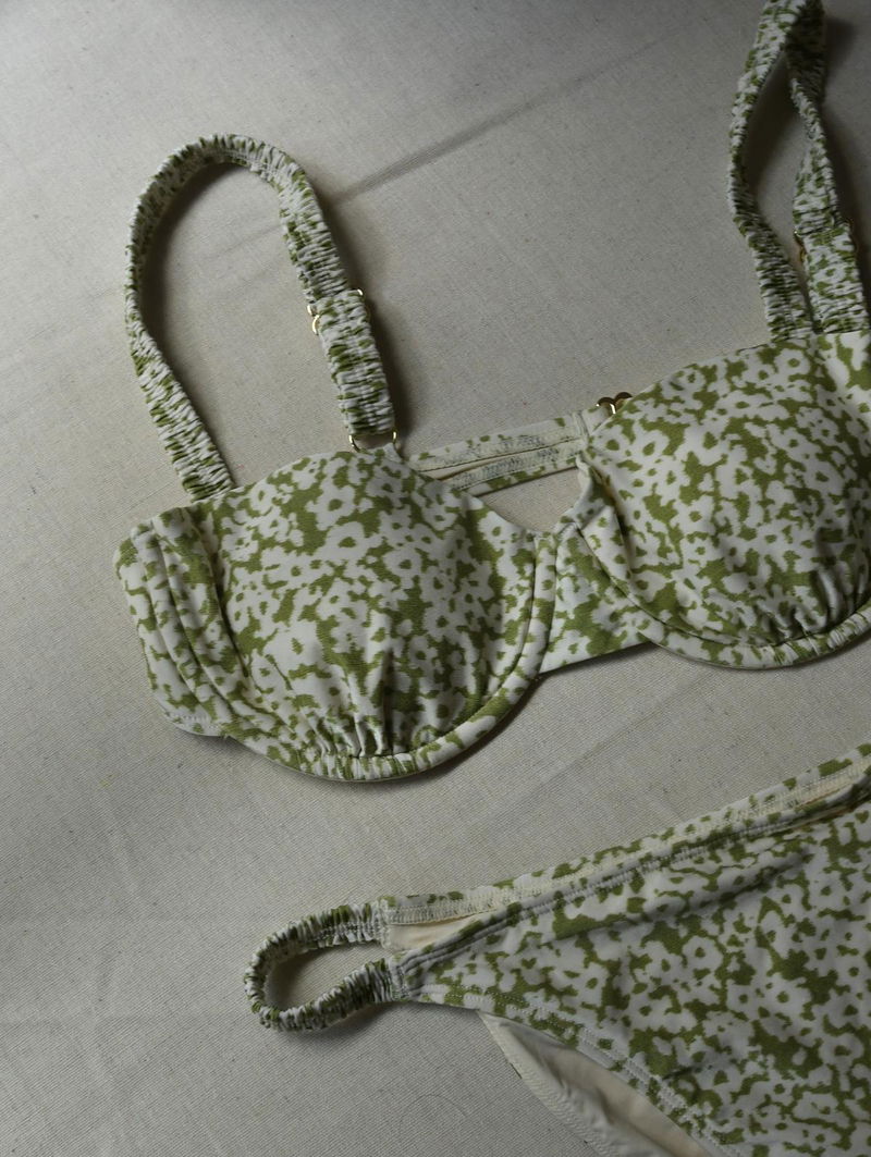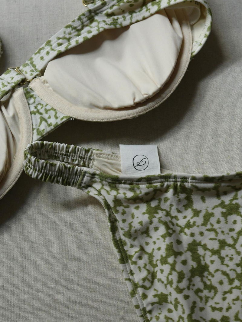Eden Print light green and white ditsy floral pattern. The top is underwired with adjustable straps and the bottoms are a mid rise high cut.
