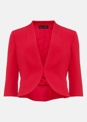 A smart structured knit jacket with an open front, soft ruching at the shoulders and long length sleeves. This cropped design is collarless and has a clean, boxy fit.