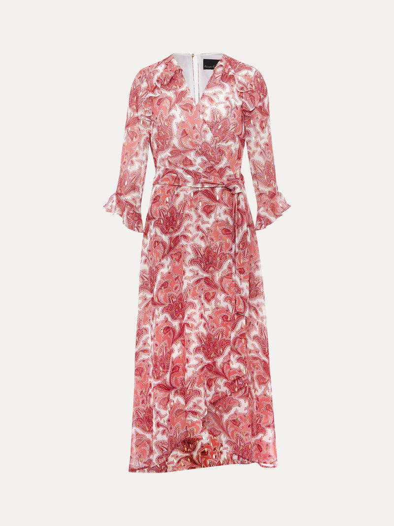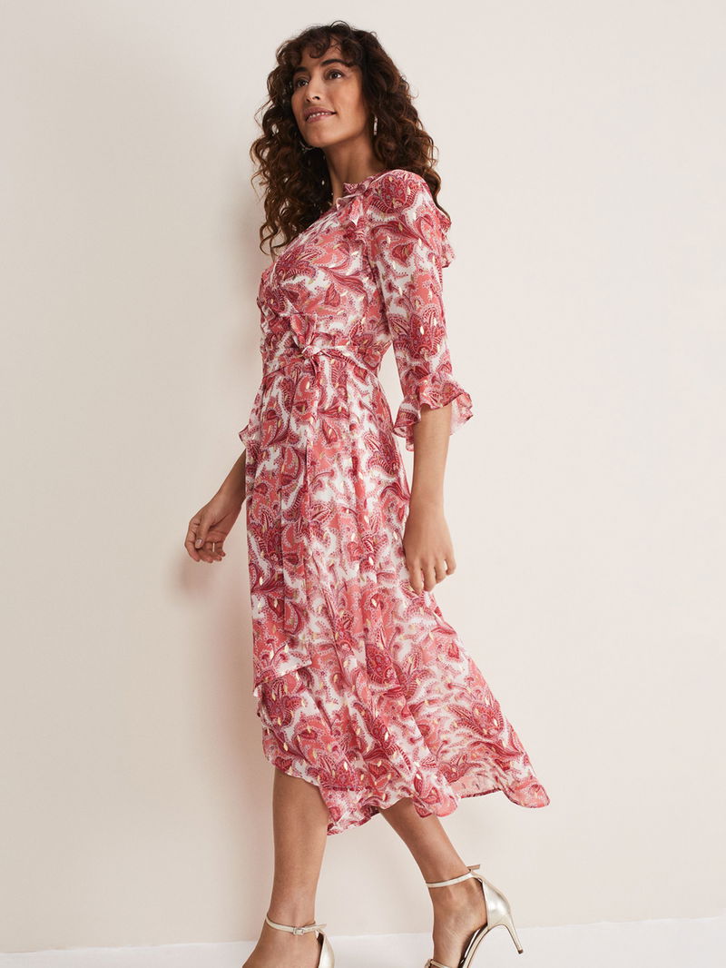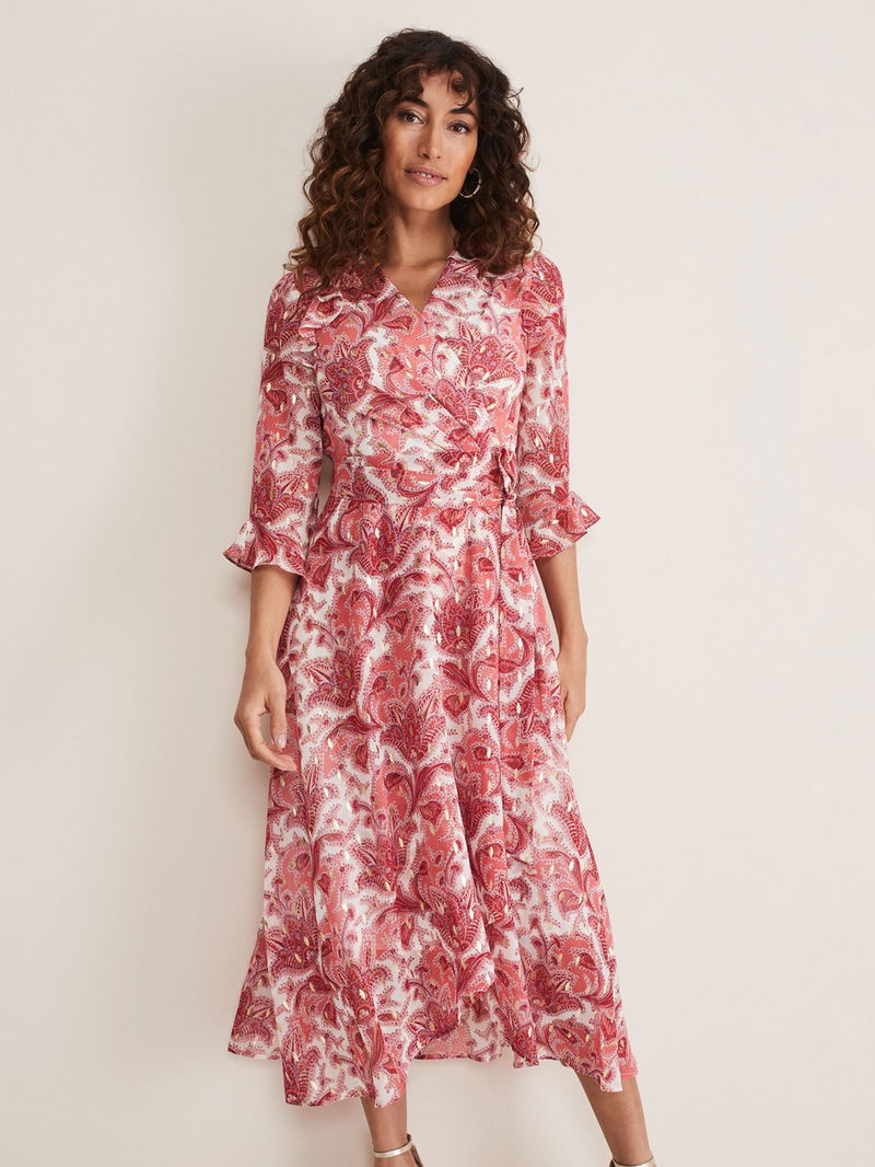 Easy to wear in an asymmetric A-line silhouette, this midi dress by Phase Eight is brought to life with an abstract print with metallic accents. Accentuating the figure with a wrap over front and three-quarter length sleeves with bell cuffs, it is a smart option for formal summer affairs.