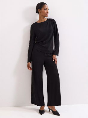 Versatile and effortless. Designed in black chiffon, our blouse features a rounded neckline with pleats, blouson sleeves and cuff wrist detailing. Dress up any of your separates for a dressed up look.