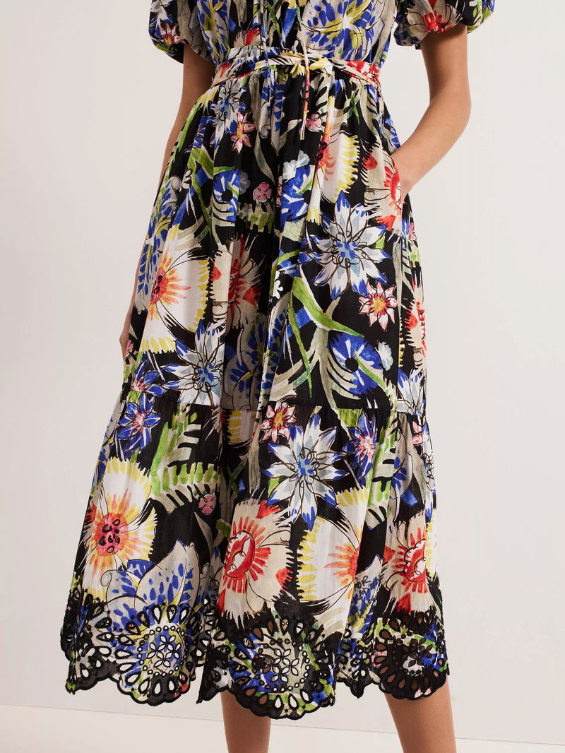 Puff sleeves create volume, emphasising the elegant scoop neckline. Finished with intricate broderie detailing at the hem for a contemporary edge.
