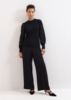 Party-ready knitwear that's effortless to wear - we love the all-over shimmer on this Becca knit, and the semi-sheer lace detailing on the neckline and 3/4 length sleeves.