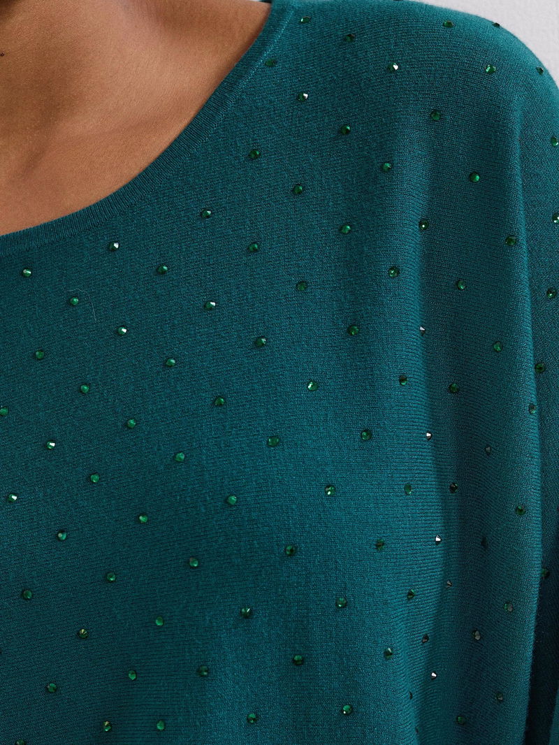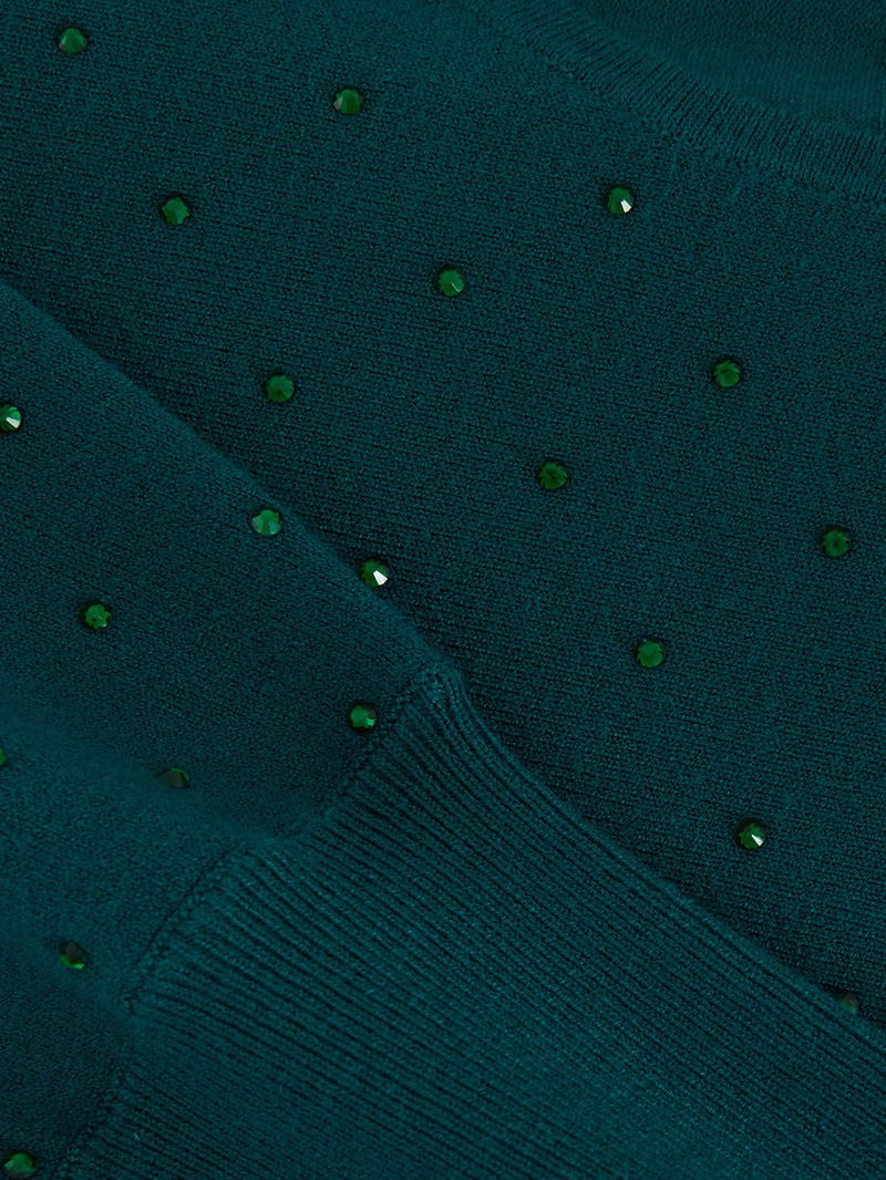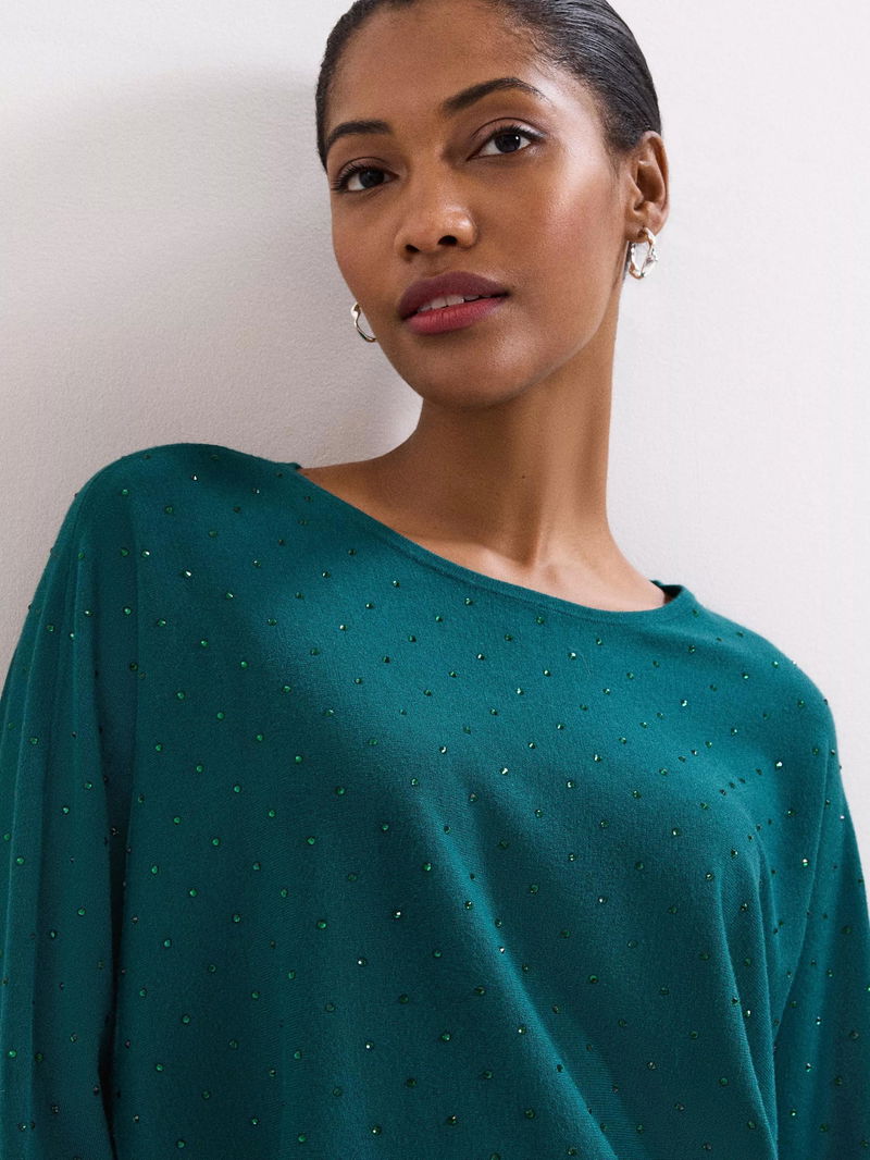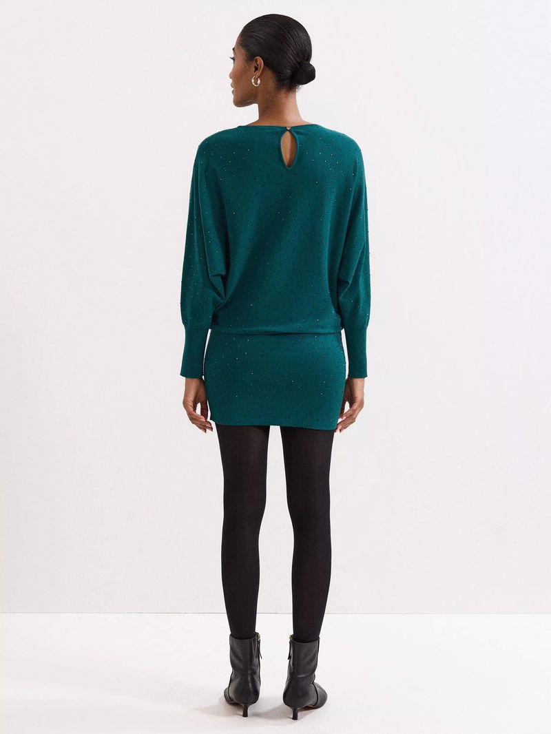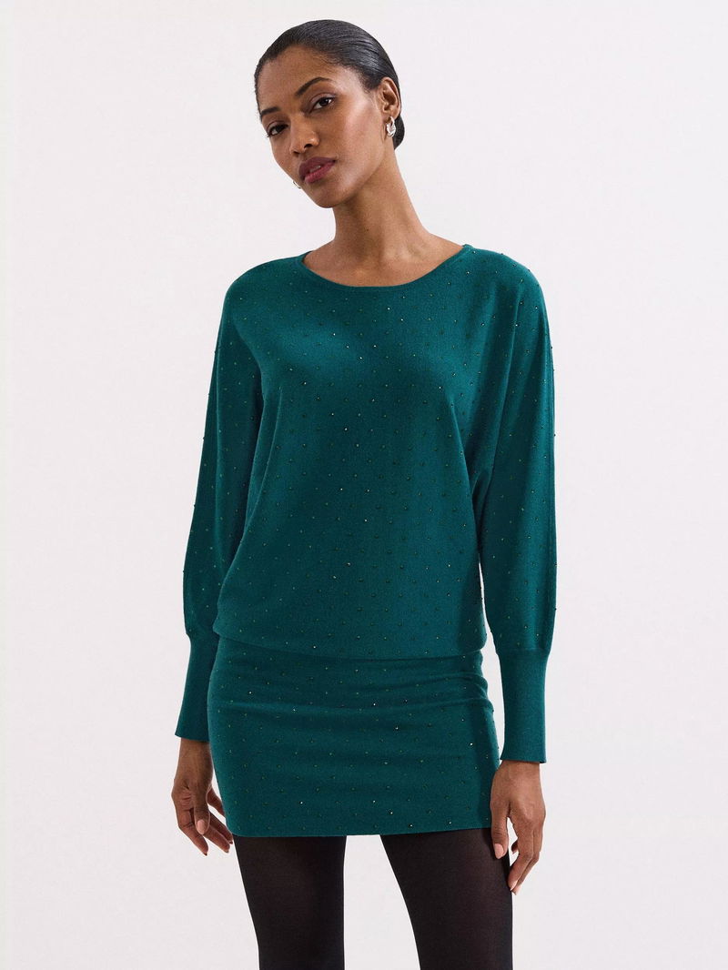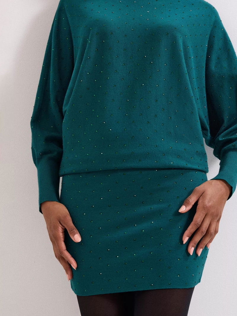 This mini jumper style is designed with a ribbed bodycon skirt and a relaxed fitting top, elevated with a feminine slash neck. Featuring matching stud detailing that catches the light, we love this playful style for heading into the festive season with tights and a pair of boots or heels.