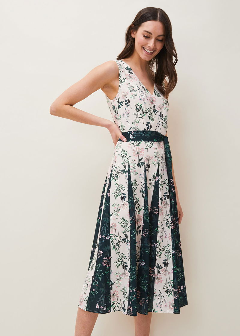 The Bernita Dress is cut in a flattering fit and flare shape to highlight your silhouette. Designed with a pretty floral print and contrast patched godets in the skirt. Finished with a contrast waist tie and V-neckline.