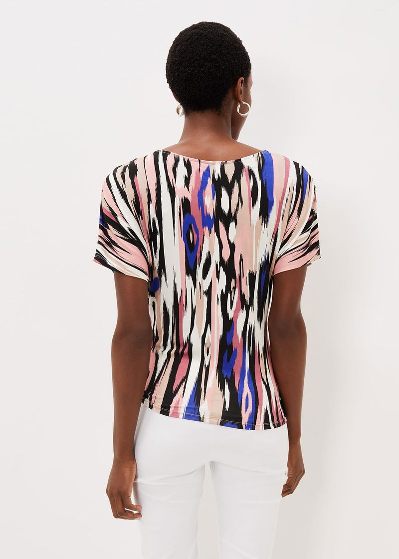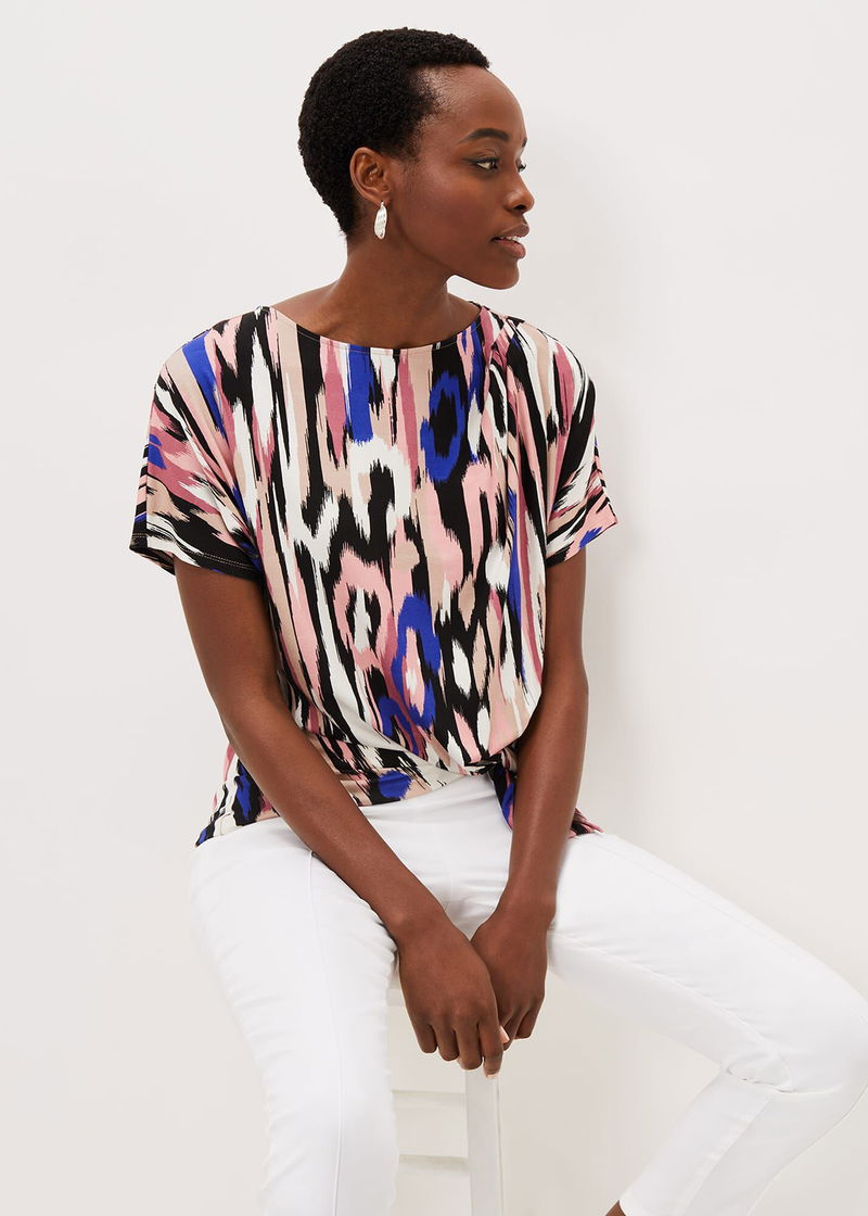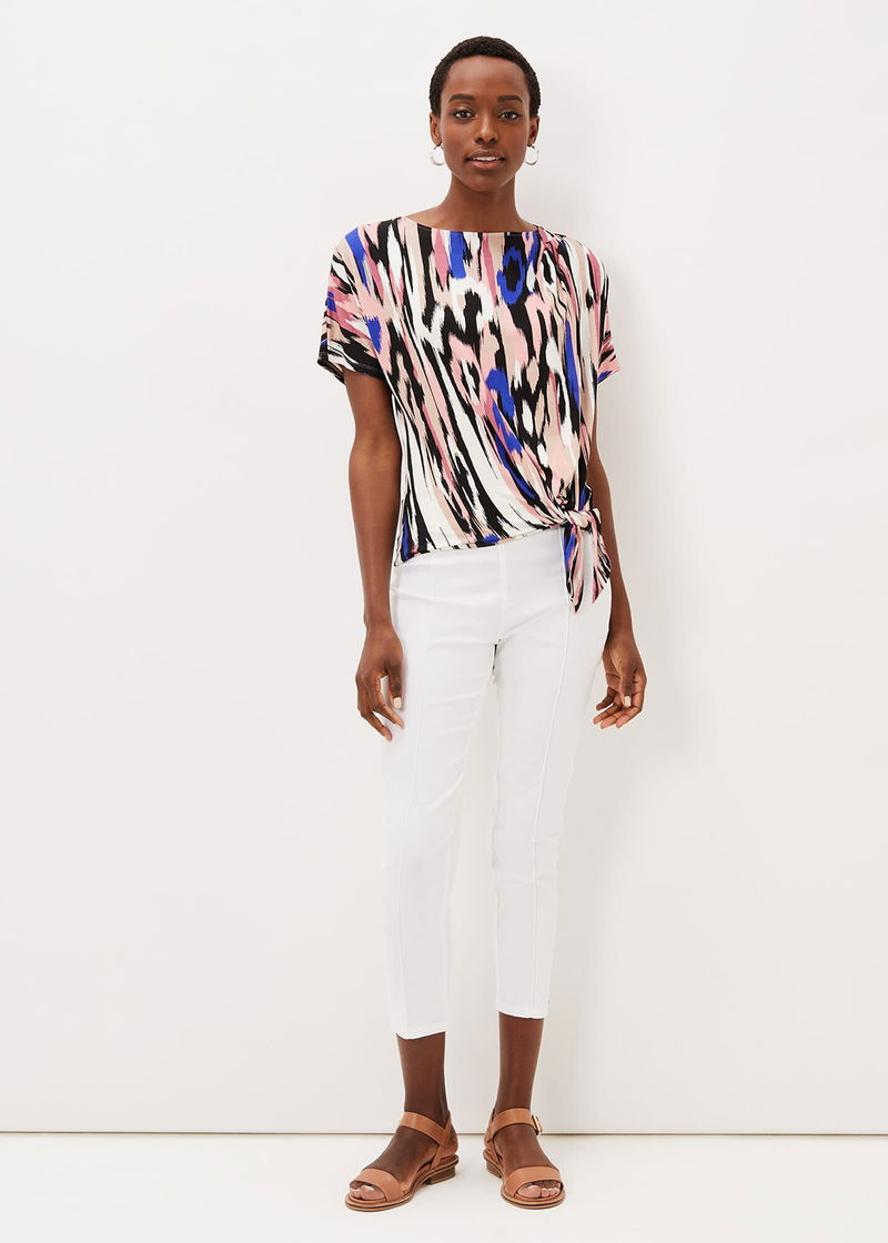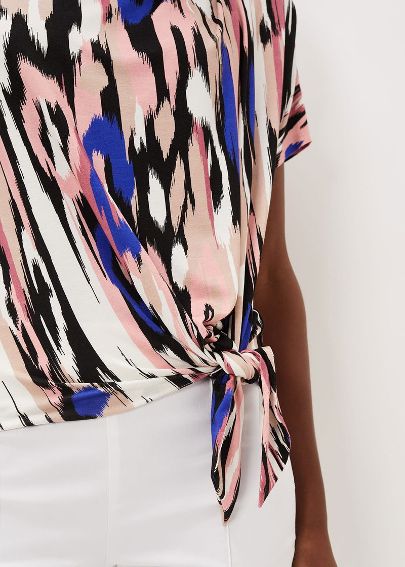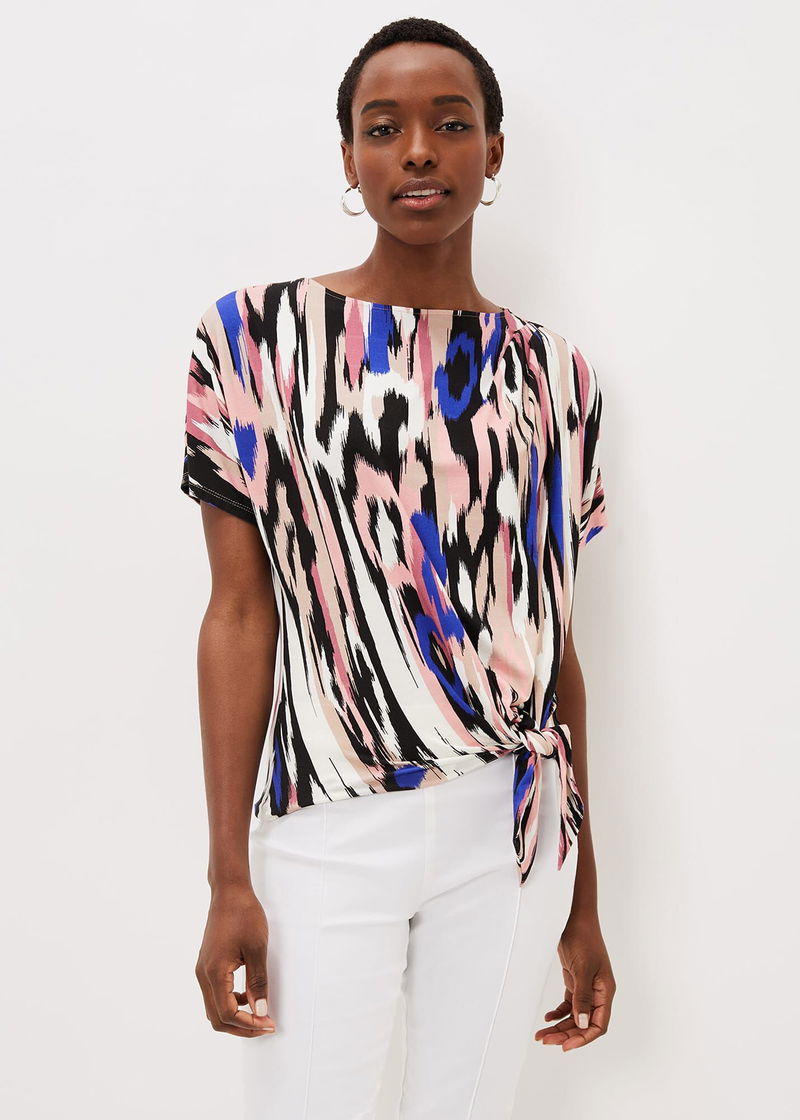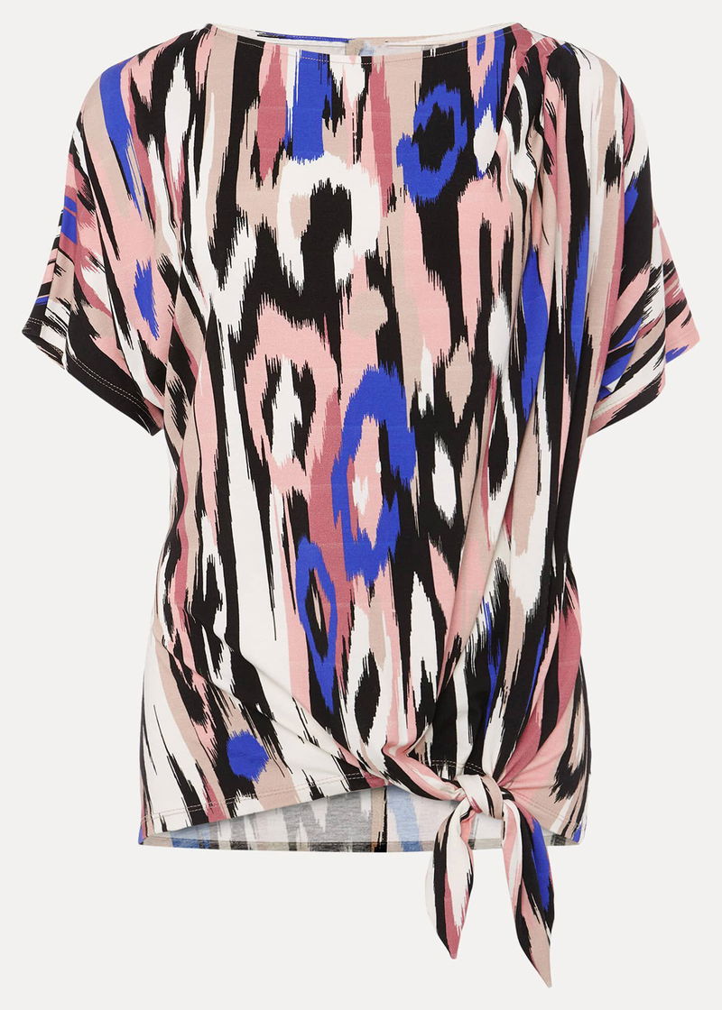 An easy styling piece for your everyday wardrobe. Designed in an effortless shape with a flattering boat neck, short sleeves and tie detail at the hem. We wear ours with white jeans to let the bold print standout.