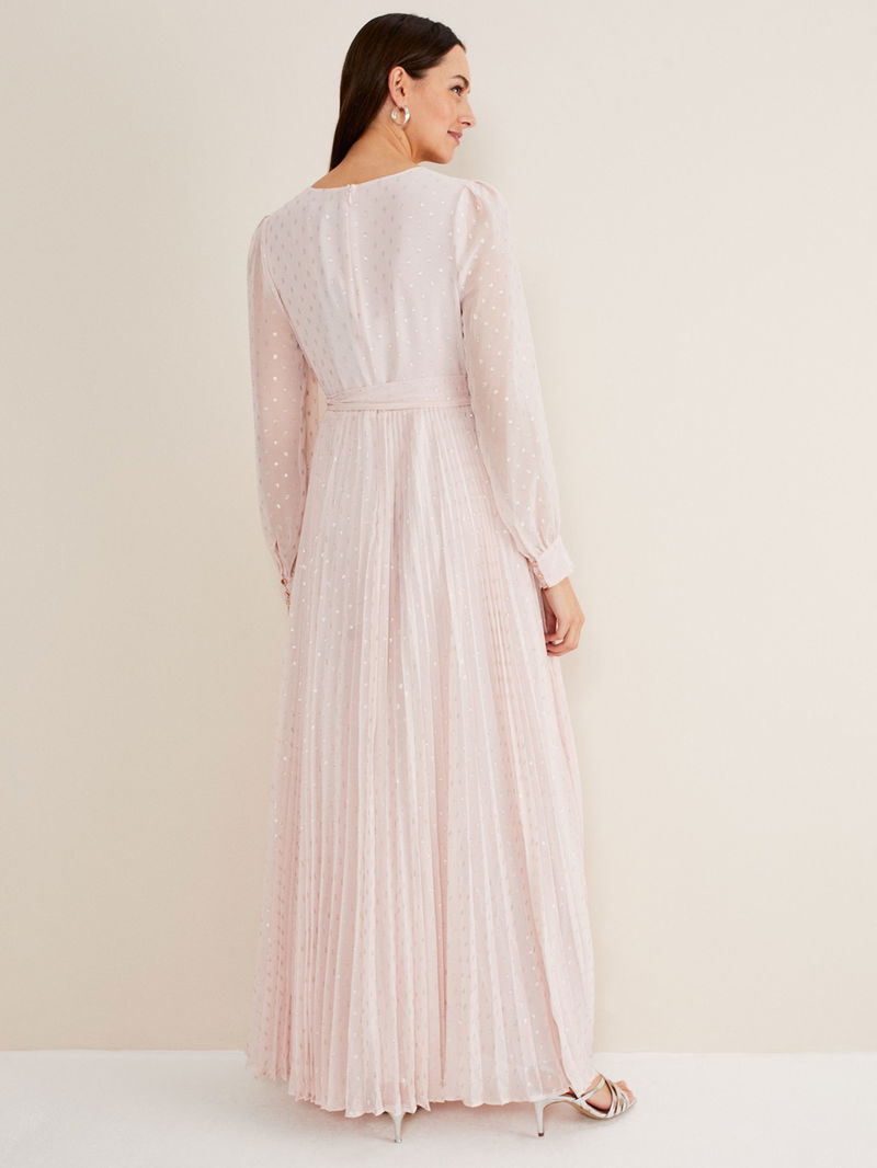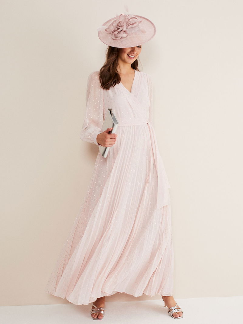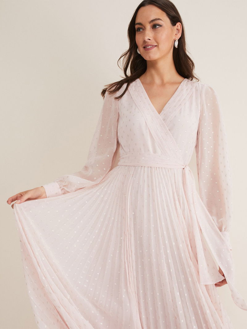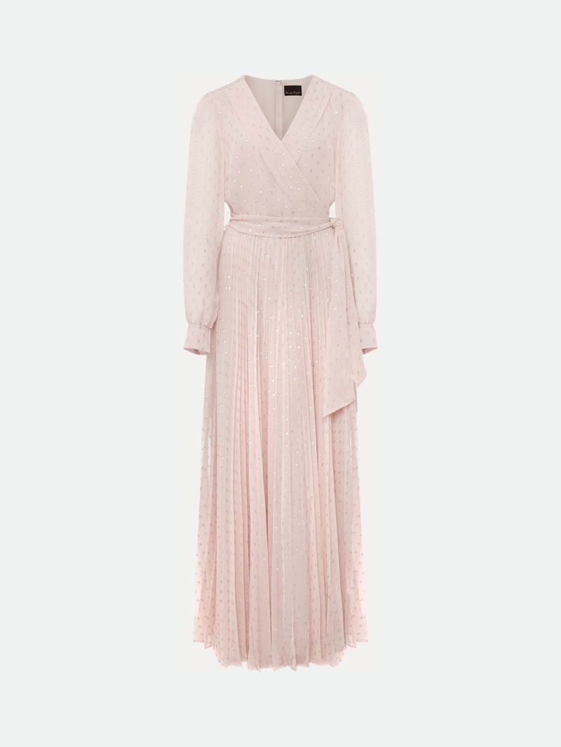Styled in a flattering wrap over front, this maxi dress by Phase Eight is accented with subtle metallic spots. Framed with a v-neckline and long sleeves, it is sure to dazzle at special occasions.