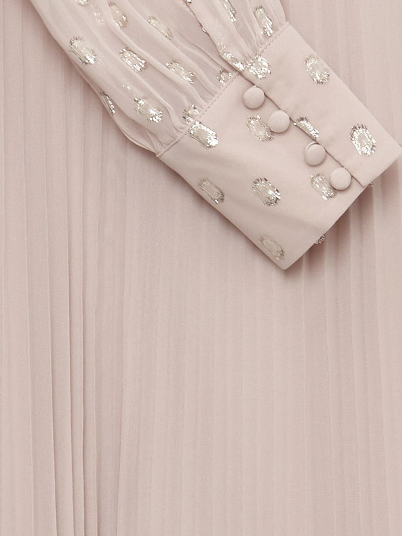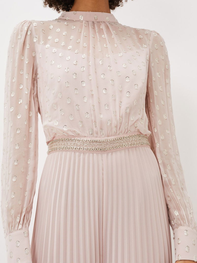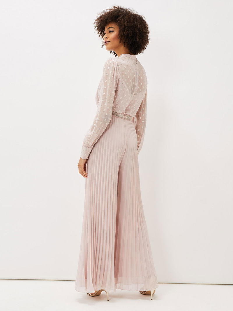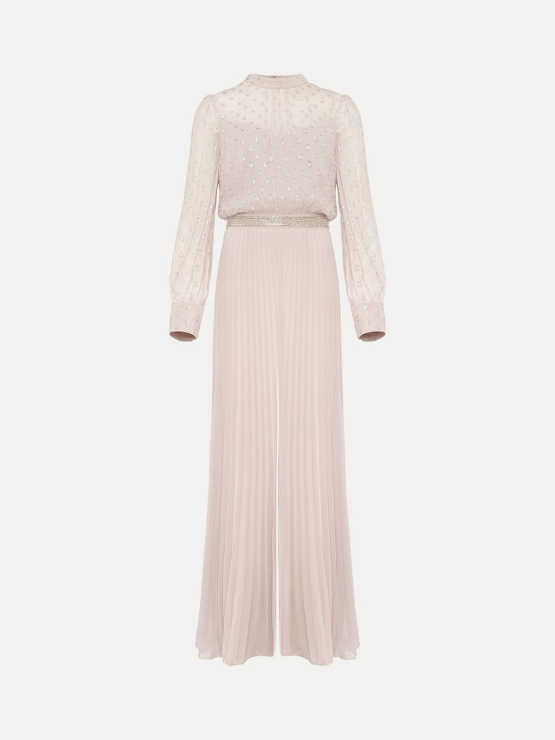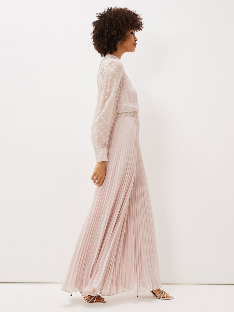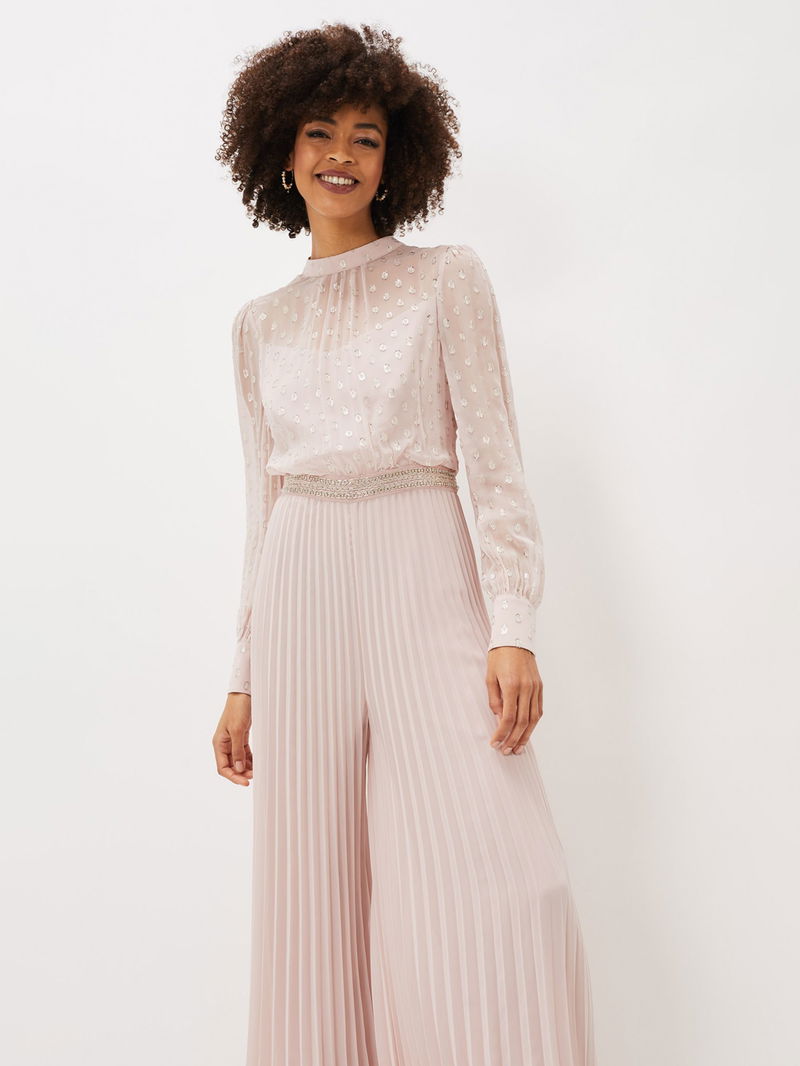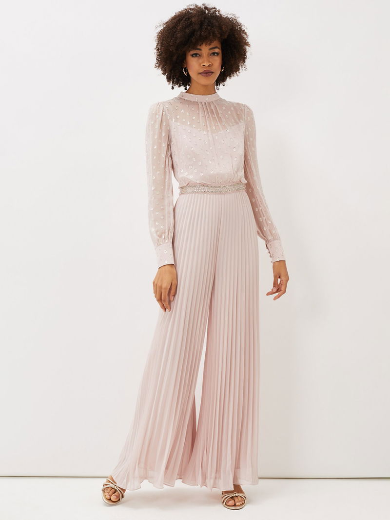Kept simple with a round neckline and long sleeves, this jumpsuit from Phase Eight falls to a '70s inspired pleated flared silhouette and is made from a lightweight yet durable fabric. Detailed with a textured spotty bodice, this outfit is perfect for dancing the night away.