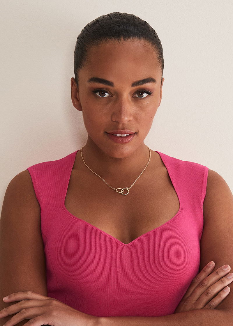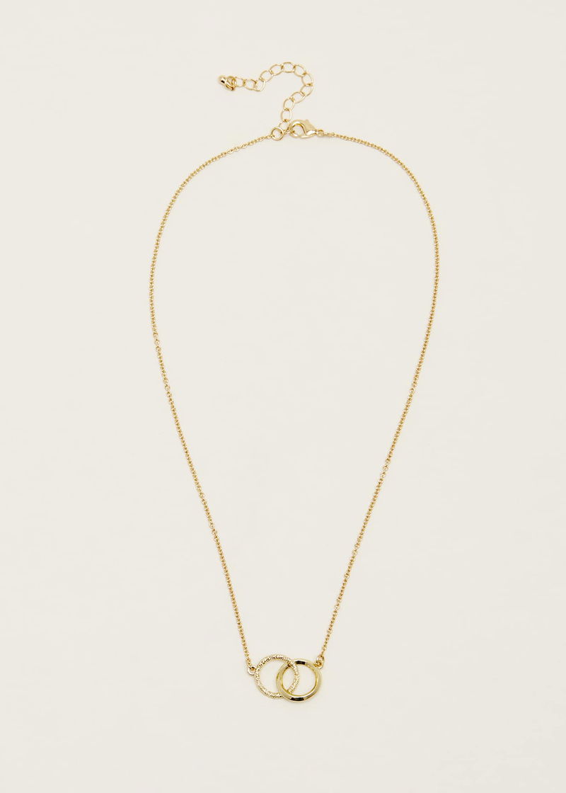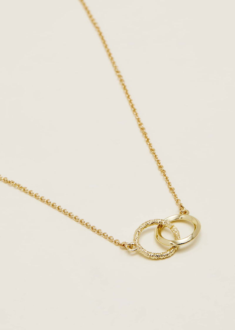 Complete your outfit with this gold necklace, featuring two connected gold hoops on a delicate chain. Wear with matching gold hoop earrings.