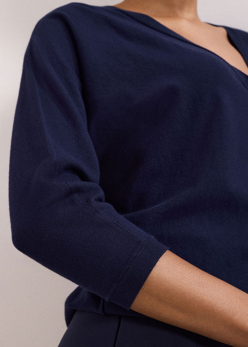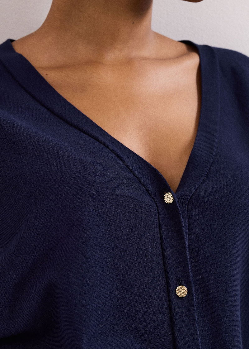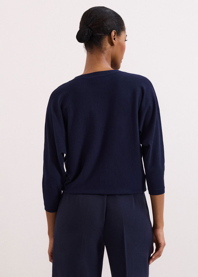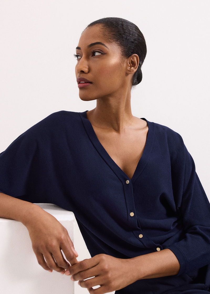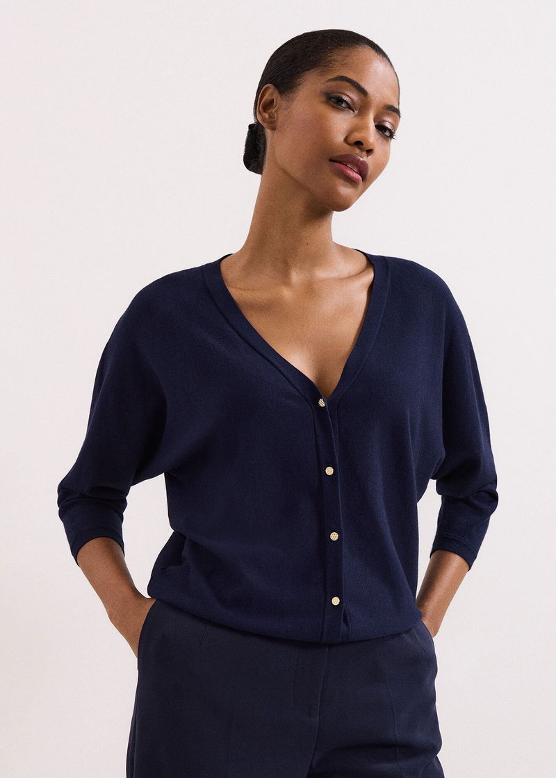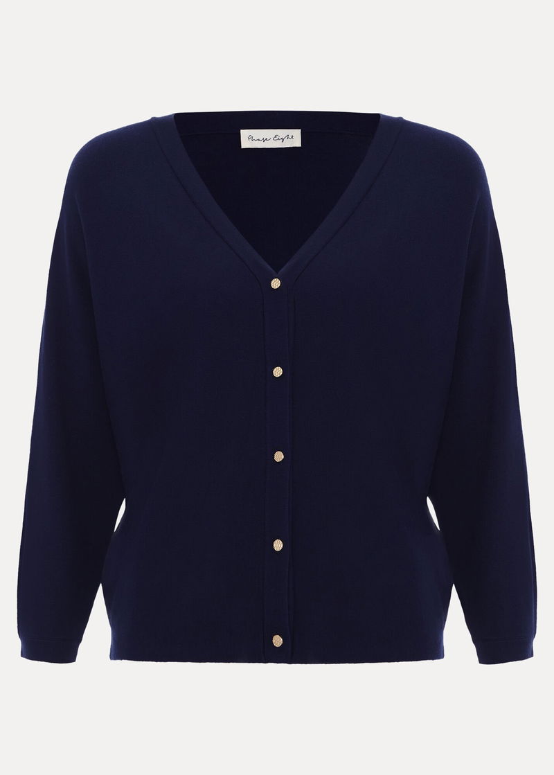 Designed with the same flattering batwing ¾ length sleeve, this navy cardigan is designed in a relaxed silhouette, with gold buttons to fasten. Wear with your favourite smart trousers or denim for an elevated everyday look.
