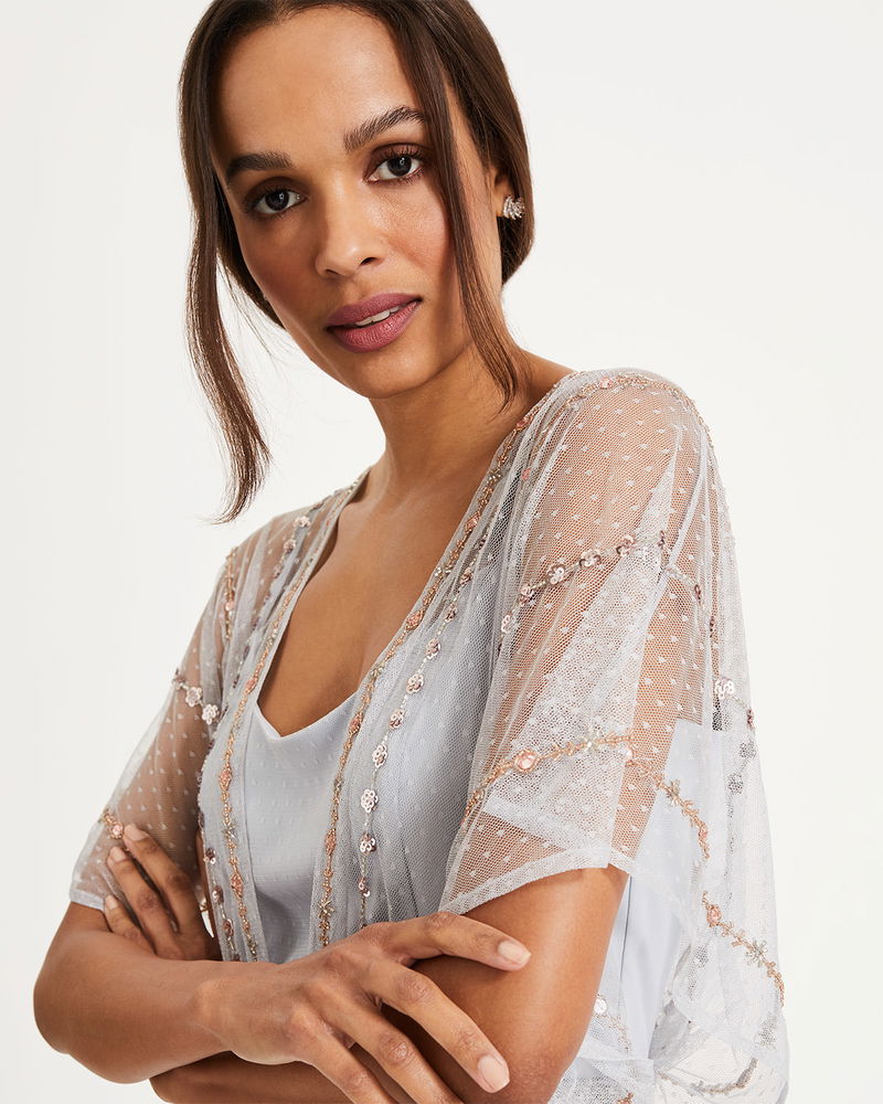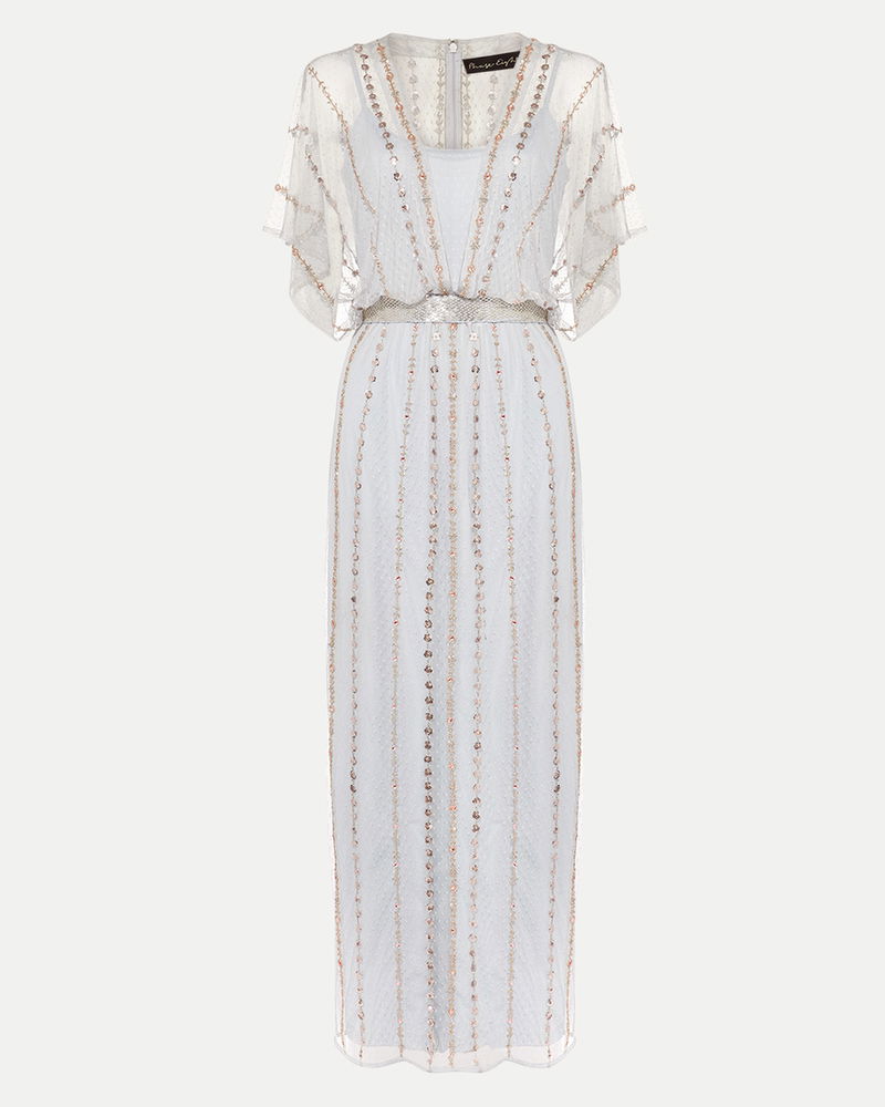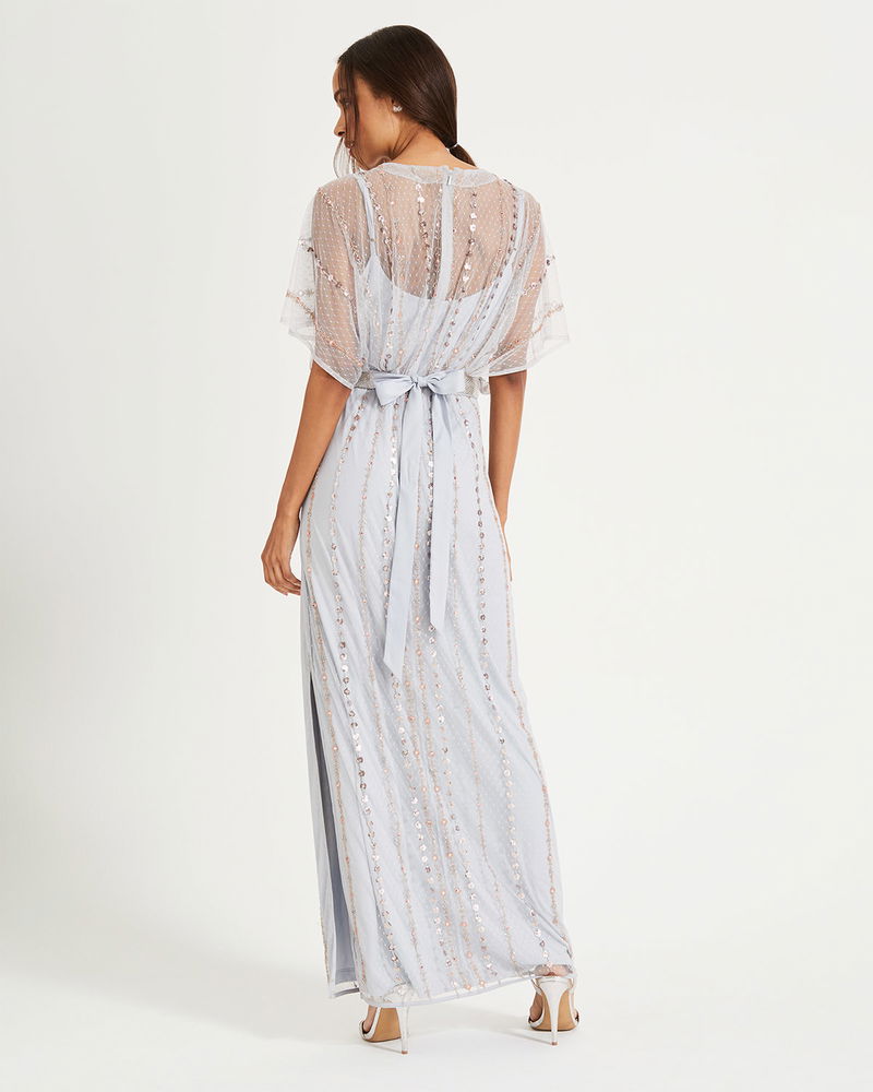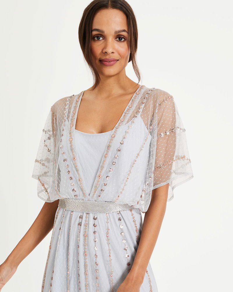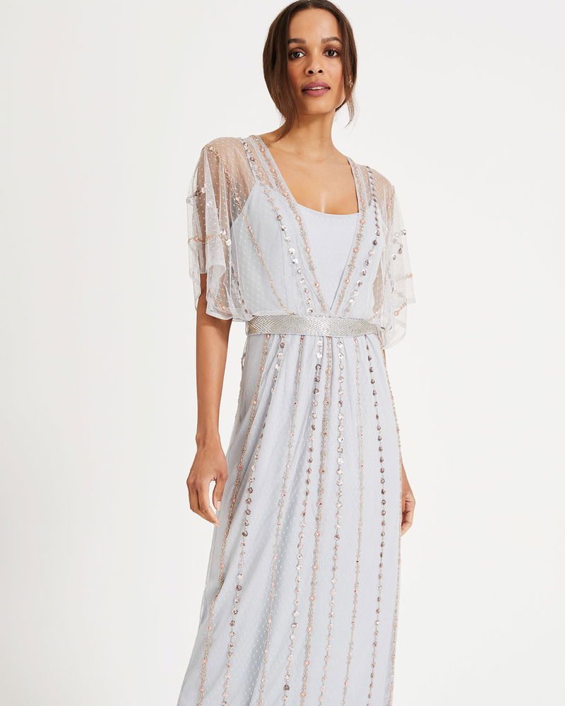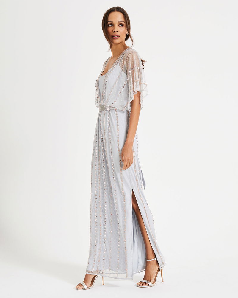 A romantic style full of detail, this full length dress is embellished with pretty beading from top top to toe. It has a belt to enhance the waist which ties at the back, plus a layered bodice with pretty semi-sheer batwing sleeves. This style is fully lined and fastens with a covered centre back zip.