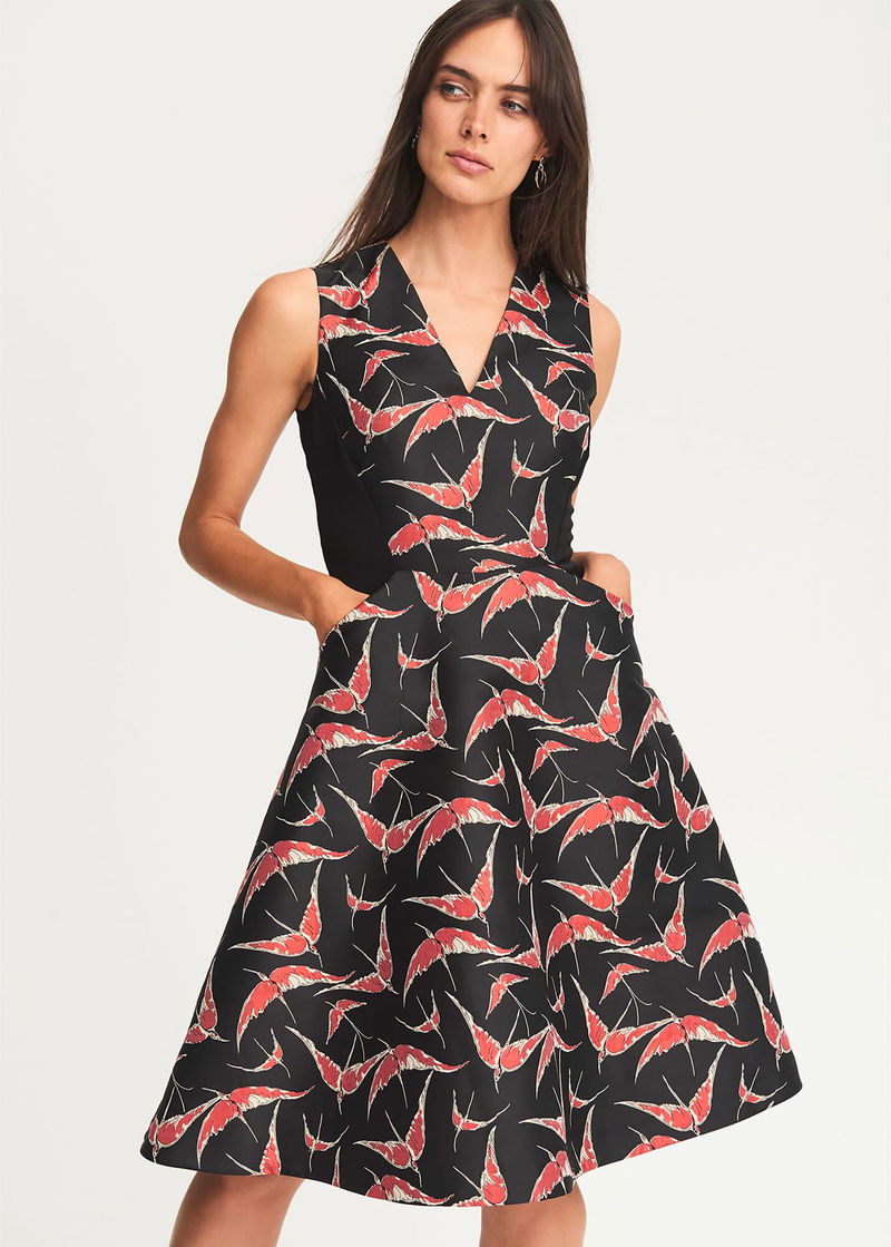 A stunning fit and flare style expertly designed for a flattering silhouette. Finished with a modern jacquard bird print and two pockets, this unique style will make a statement at every occasion.