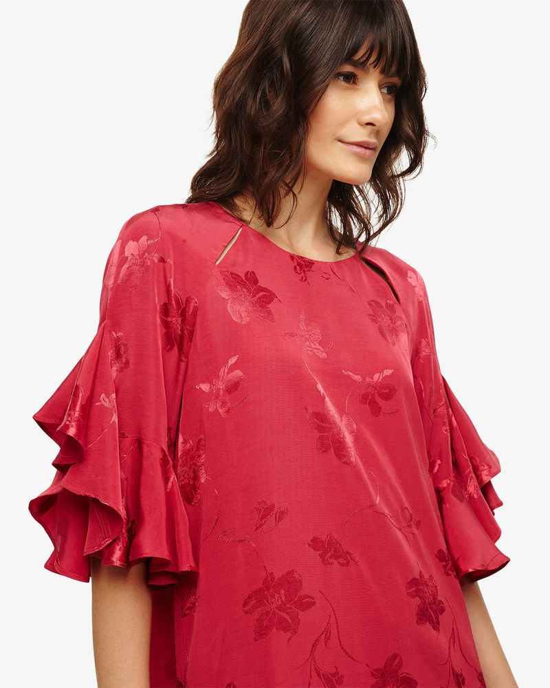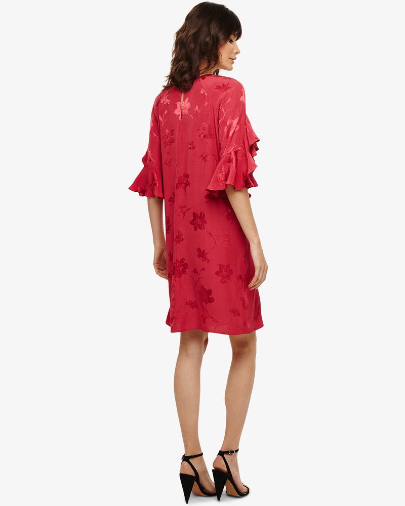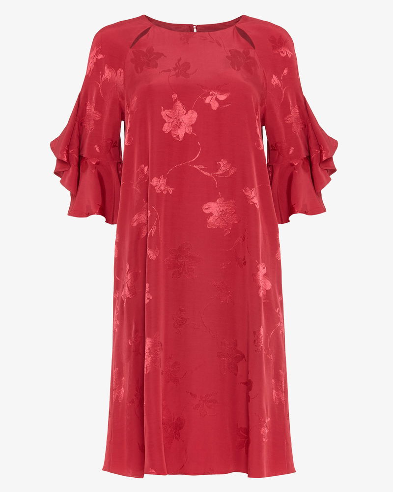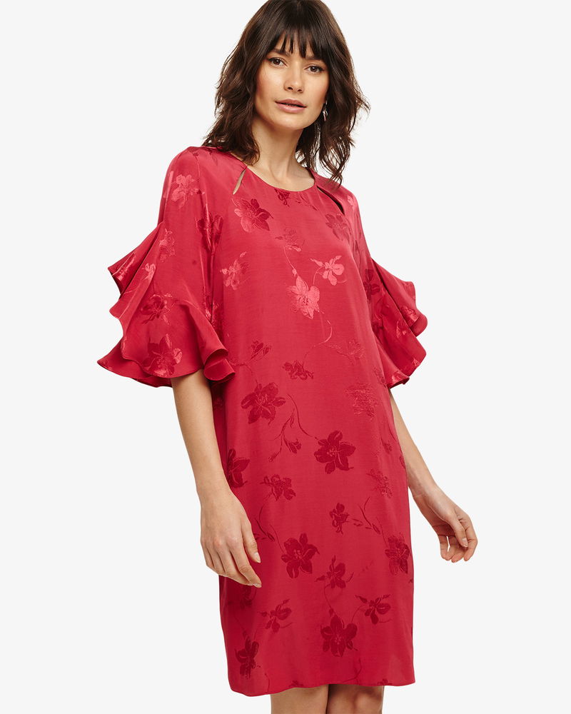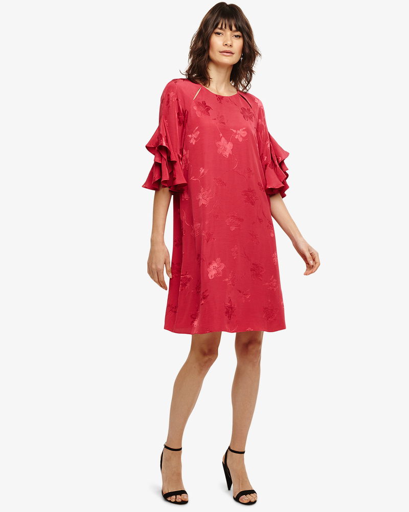 Embrace this season's relaxed take on occasion dressing with this stunning jacquard dress. Designed in an easy to wear shift shape, it has statement short sleeves and slit detailing at the round neckline. Finished with a keyhole button fastening and a knee length hem.