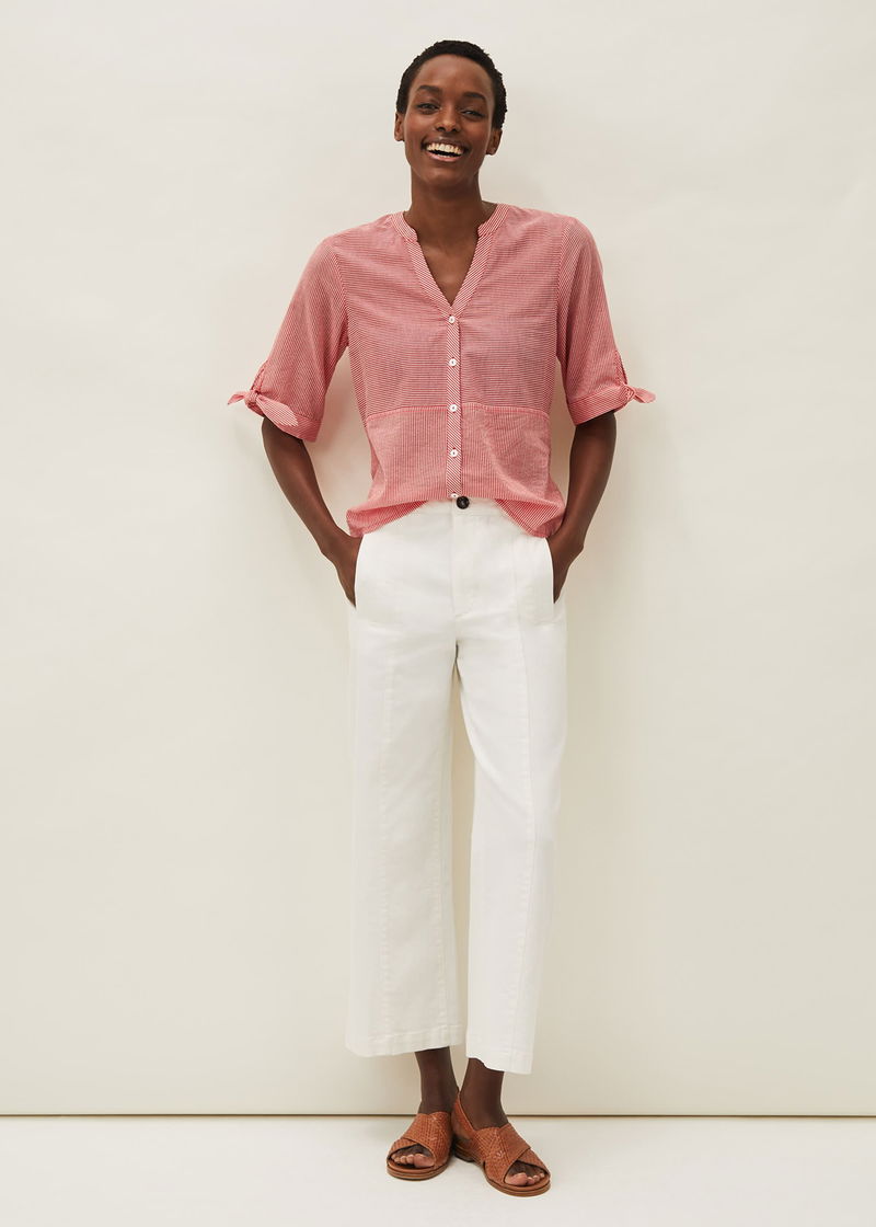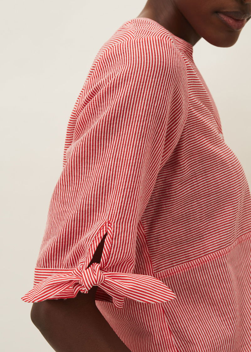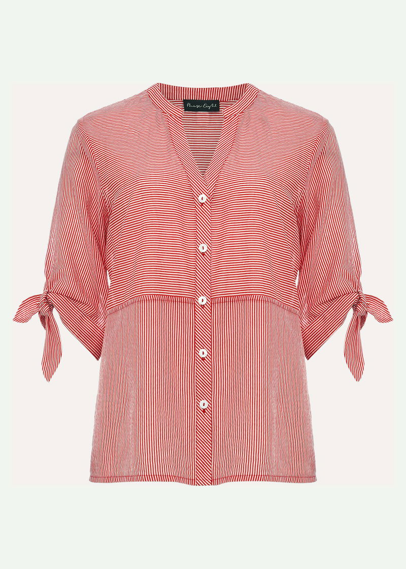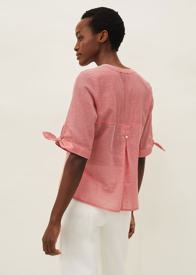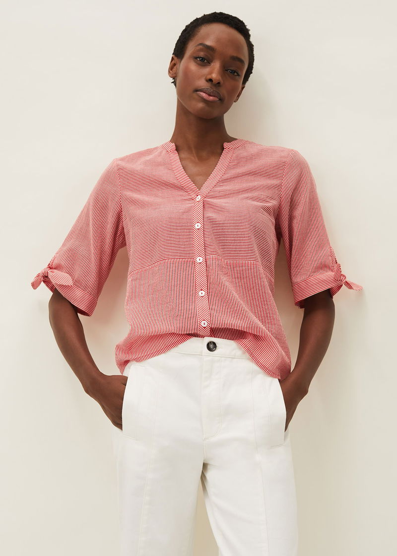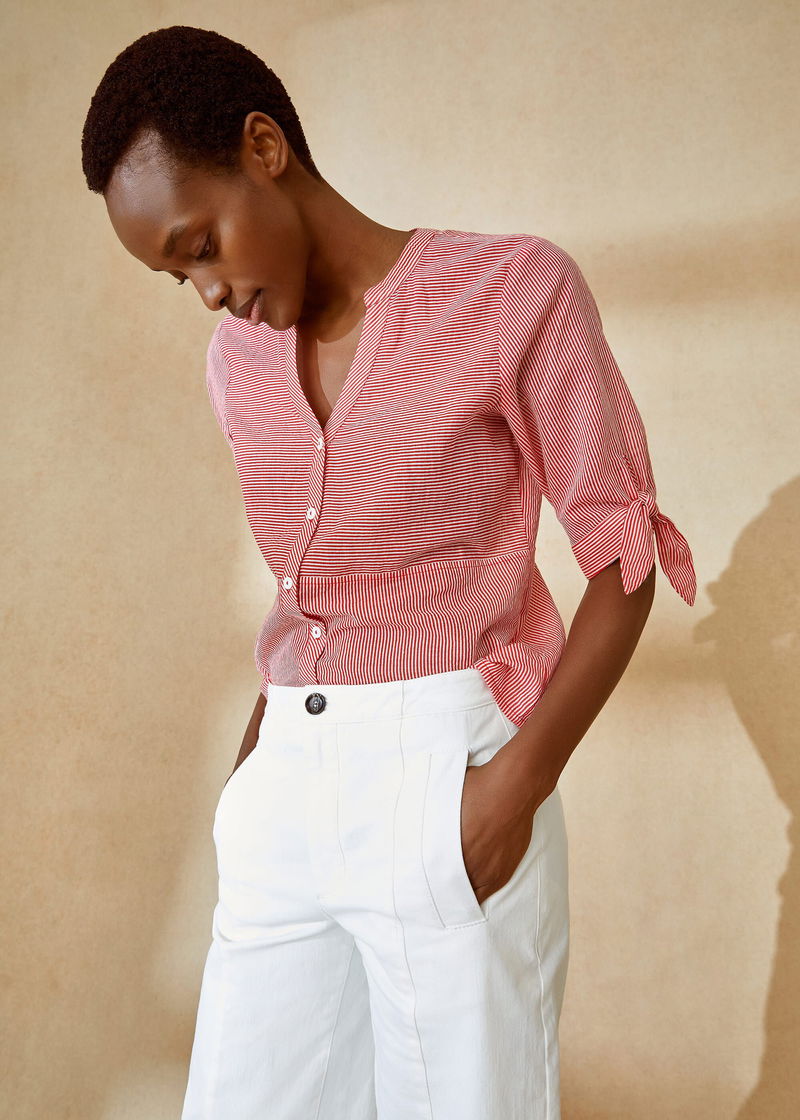 This button down blouse is a versatile style that we love wearing for work, weekends and everything in between. Created in semi-sheer 100% cotton, with our favourite stripe print, it is finished with a notch neckline, visible seaming and tie sleeve cuffs.