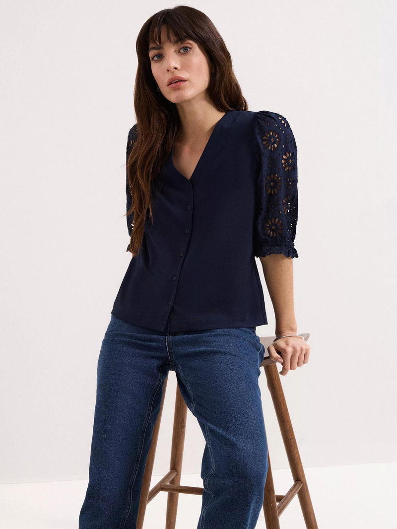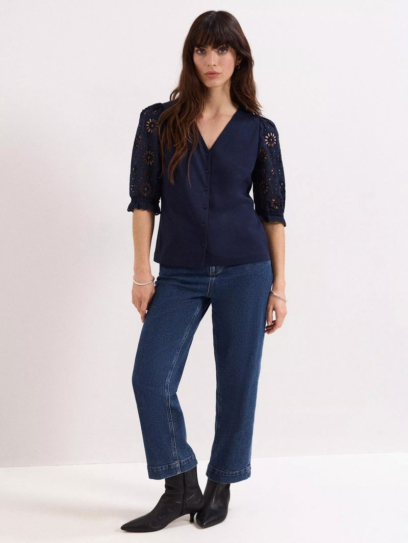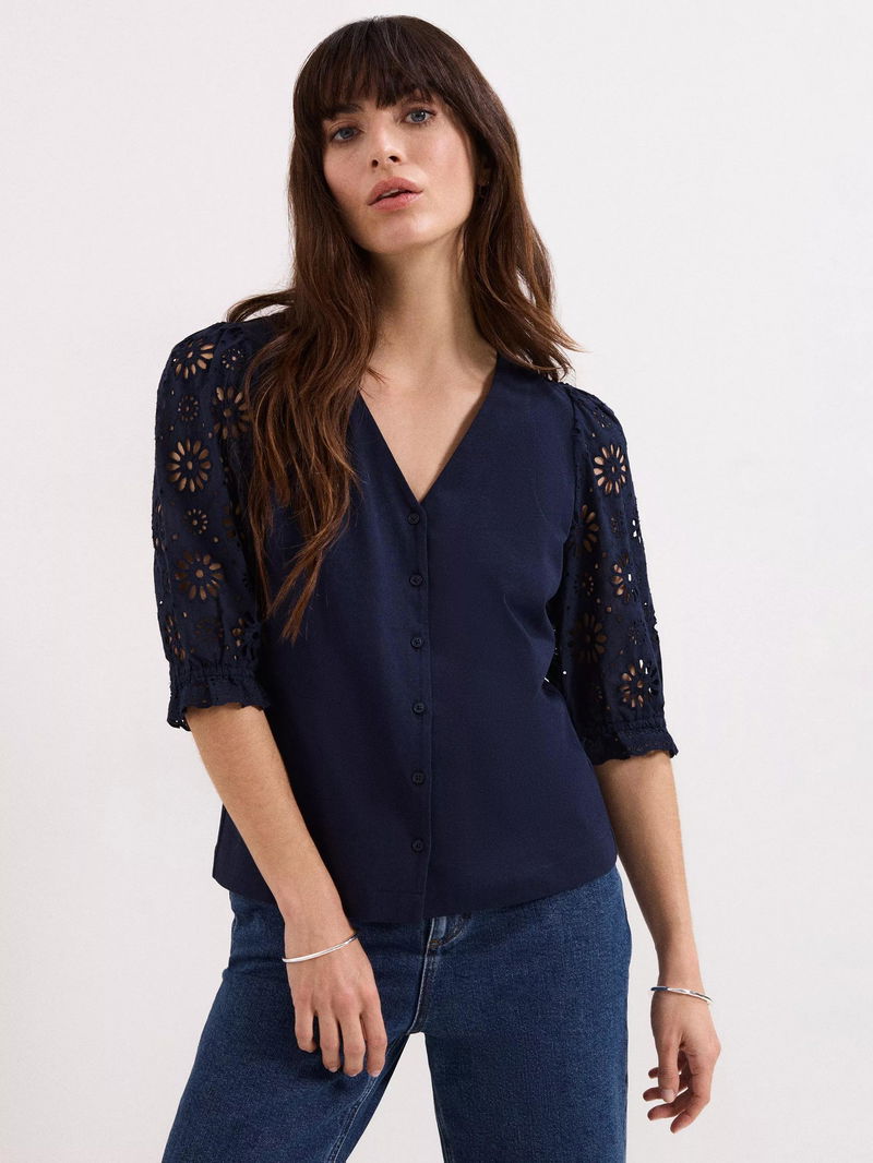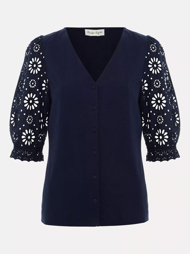 Cut from breathable cotton, this top by Phase Eight features a V-neck and elbow length sleeves that boast floral detailing.