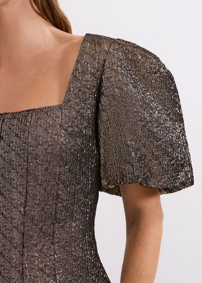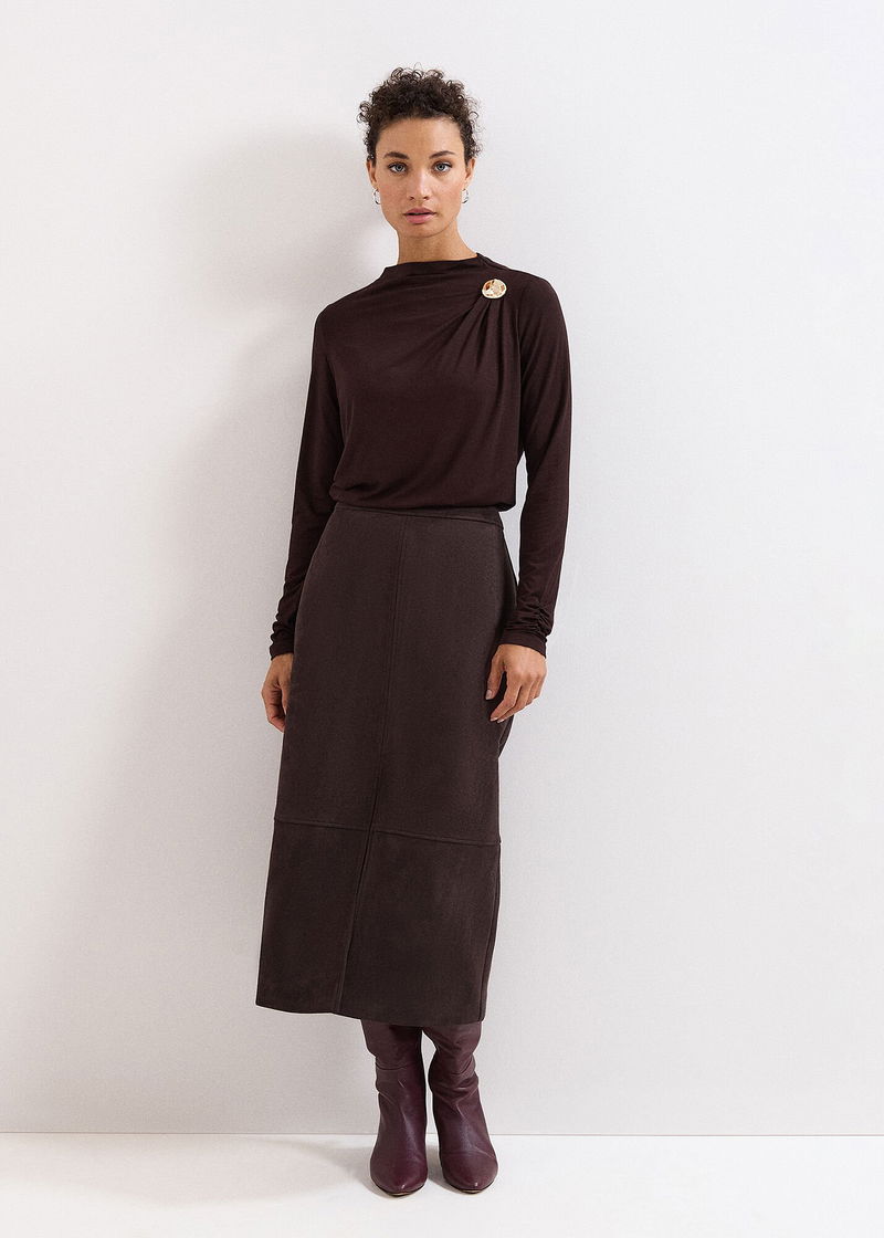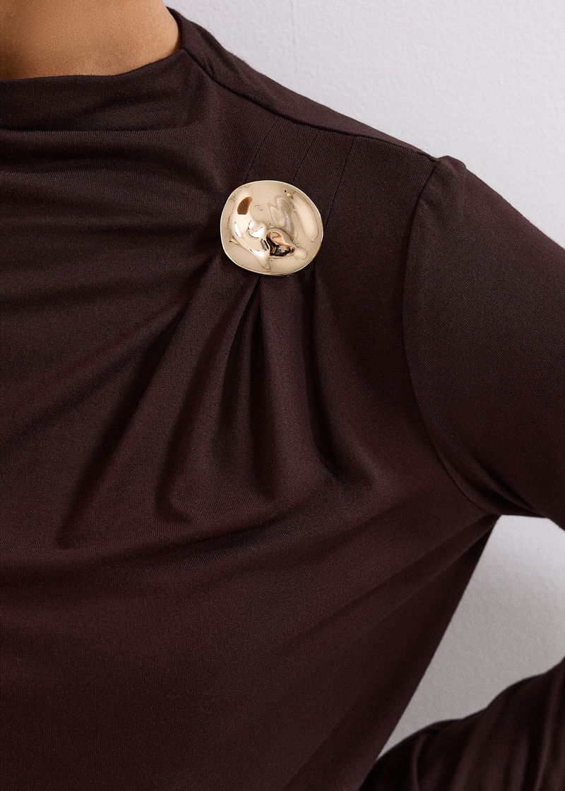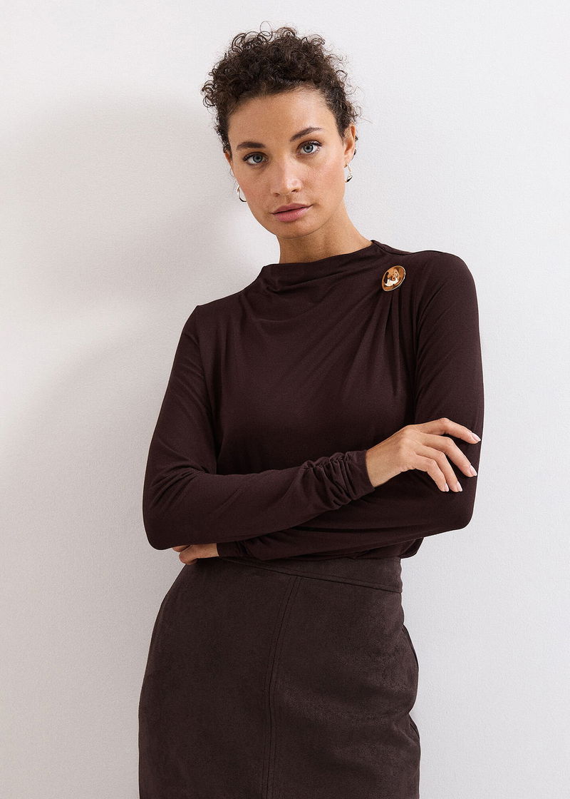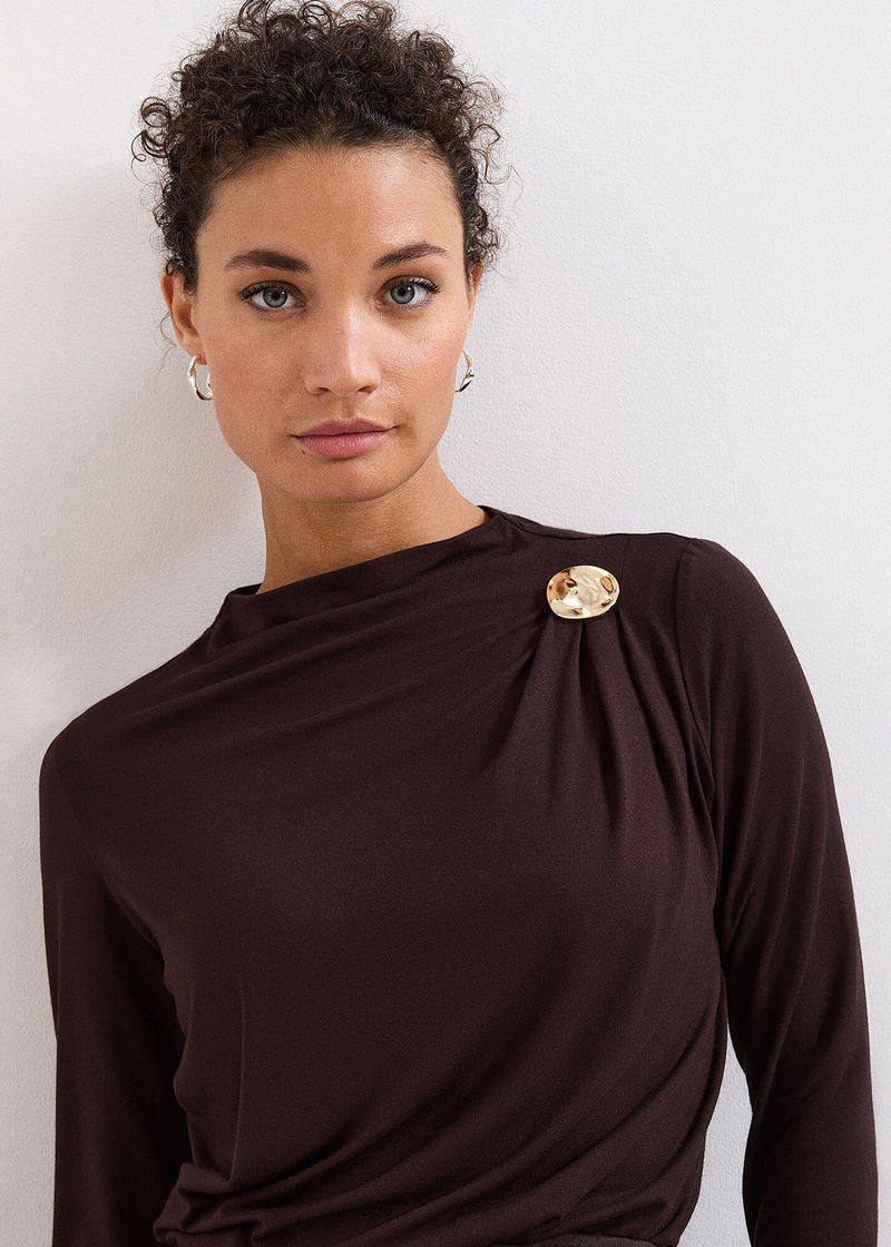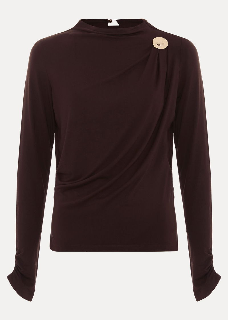 fit Your new favourite evening top. In on-trend chocolate brown, this long sleeve top’s key design features include a contemporary high neckline, statement draping for a touch of drama and fits to the body beautifully. With a luxe gold detail to the shoulder, wear this top with jeans or black trousers for an understated evening look you’ll wear on repeat.