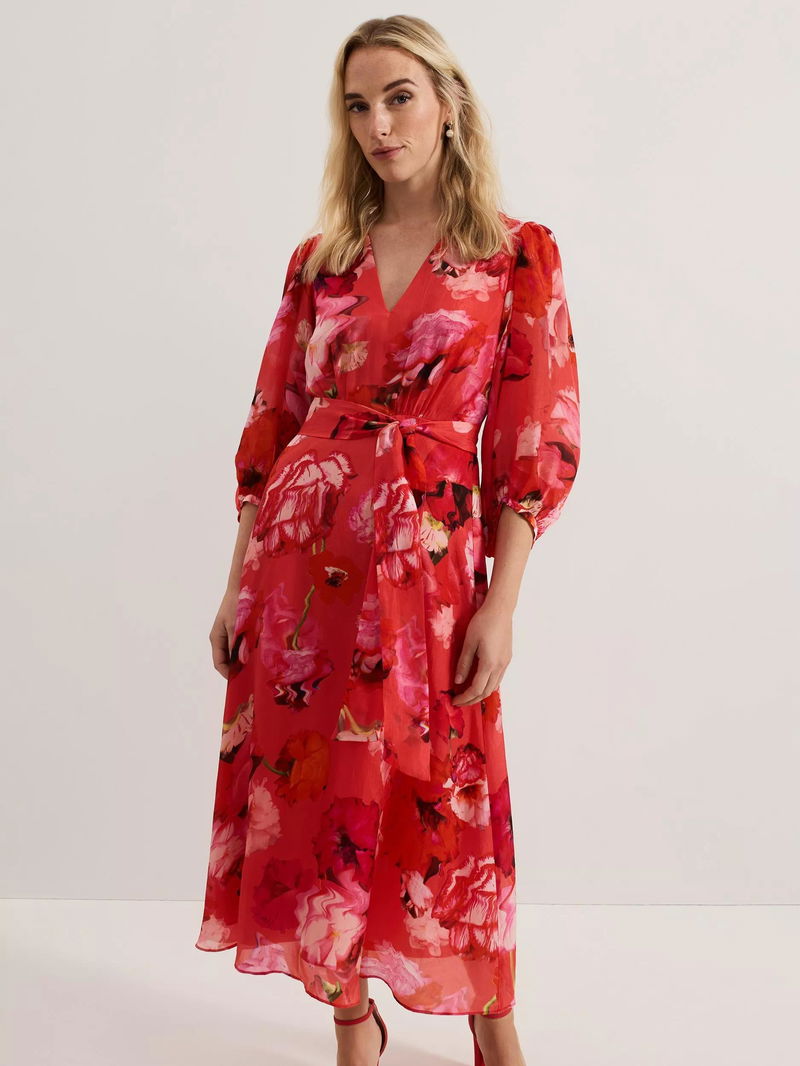 Meet your new favourite event style. With a vibrant backdrop, the Federica dress features a new in-house floral print for added interest. Finished with a matching tie detail that flatters your figure it flows through to a classic midi silhouette for ease of wear. We style ours with matching red accessories for a coordinated head-to-toe look.