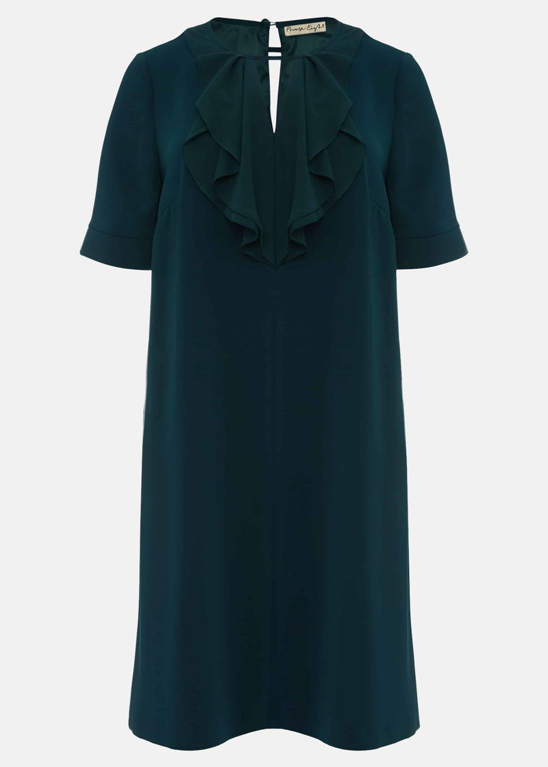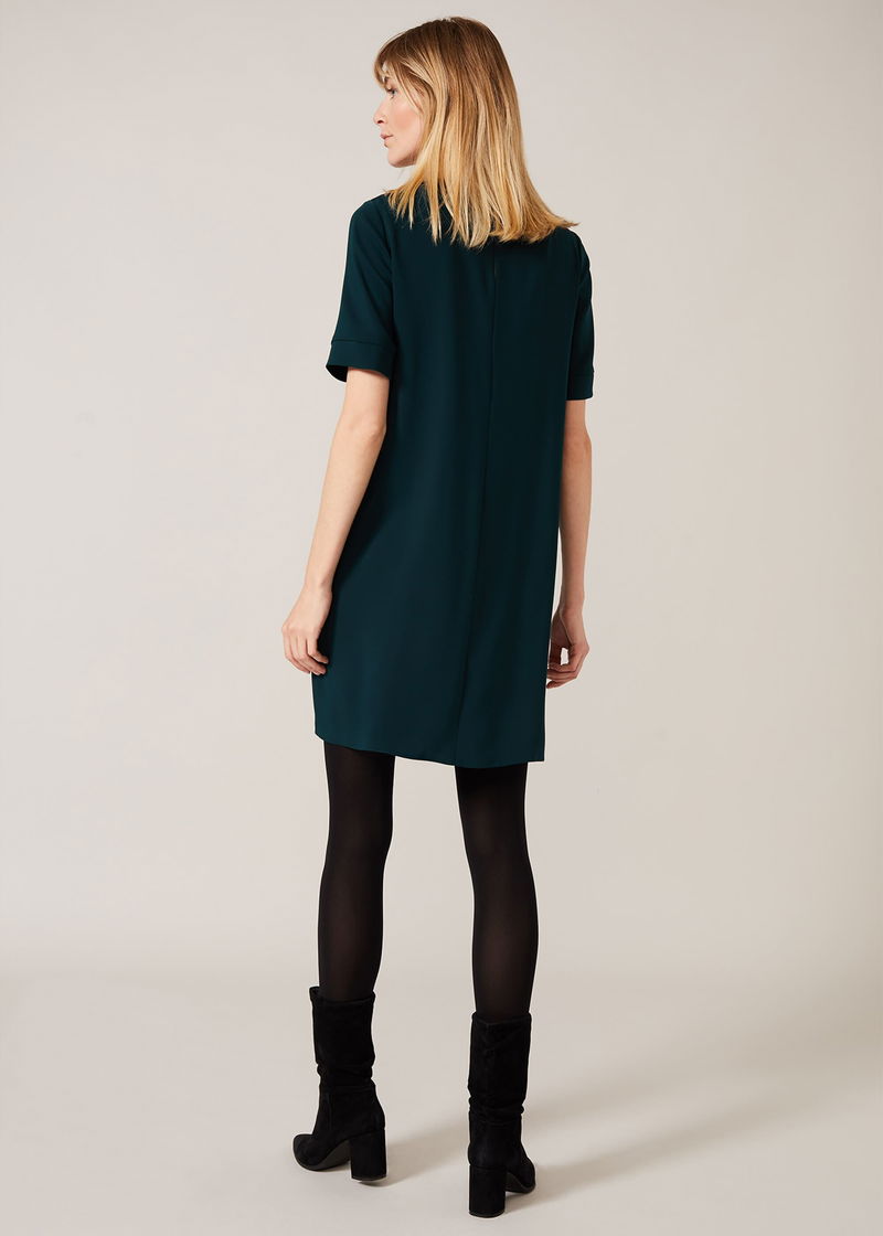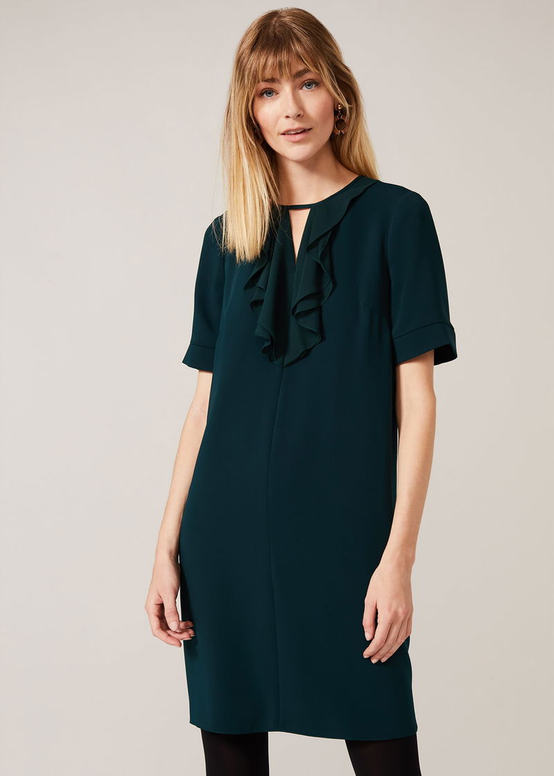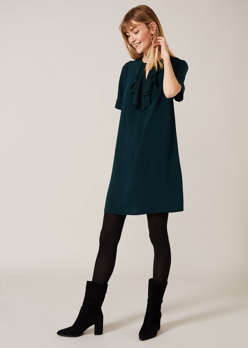 Cut in a flattering shift shape with modern frill detailing at the neck, we love the easy fit of this style. This dress up, dress down design sits above the knee and has short sleeves with turned over cuffs. We're wearing ours with tights and suede boots for an effortless seasonal look.