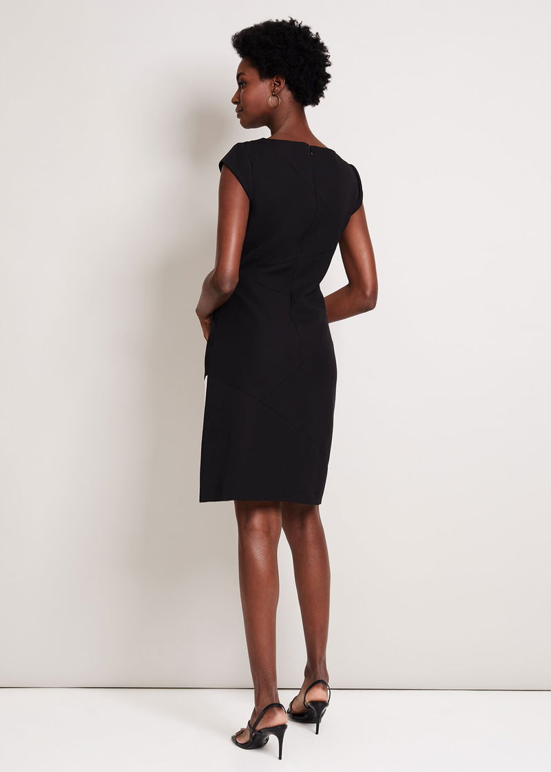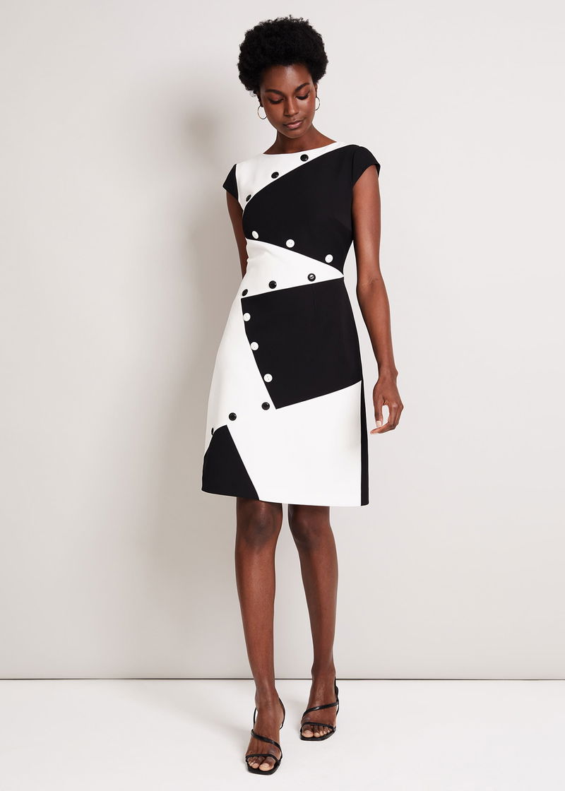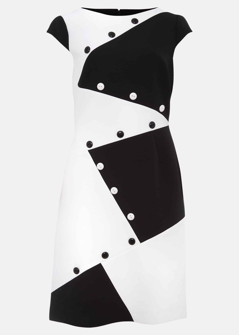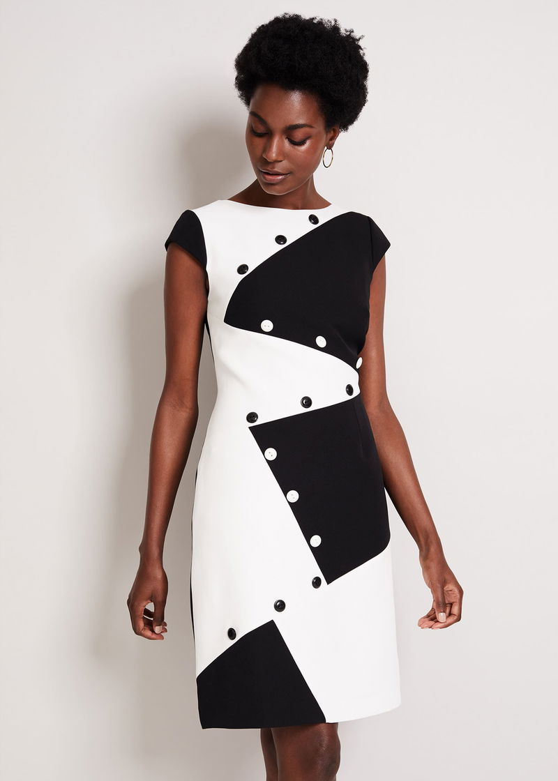 We're always in the mood for monochrome. Our Florice Dress is designed with statement zig-zag colourblocking with button details. Finished with cap sleeves and a contrast black back.