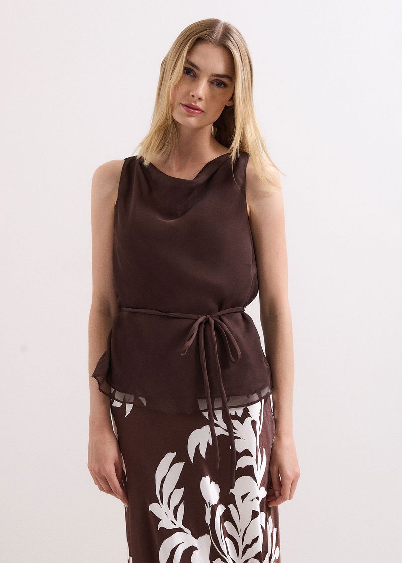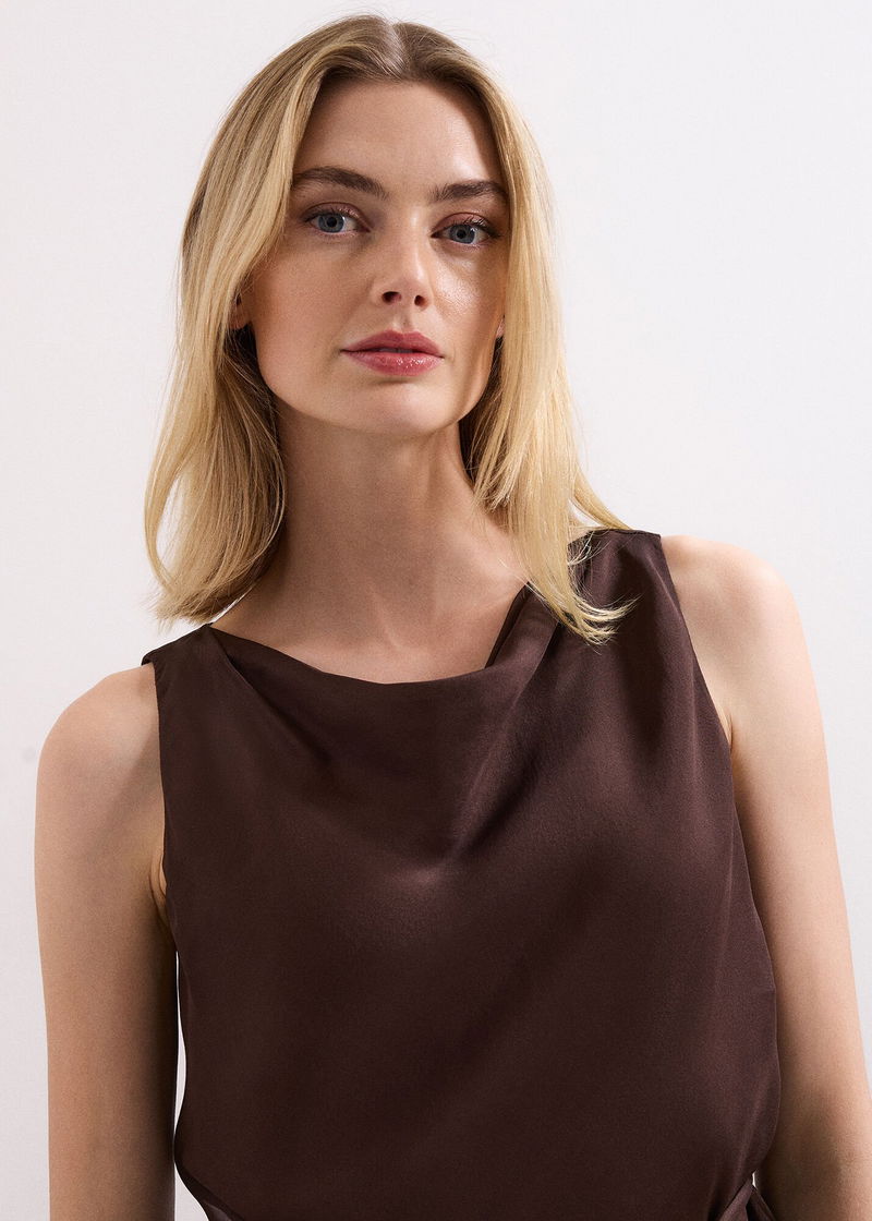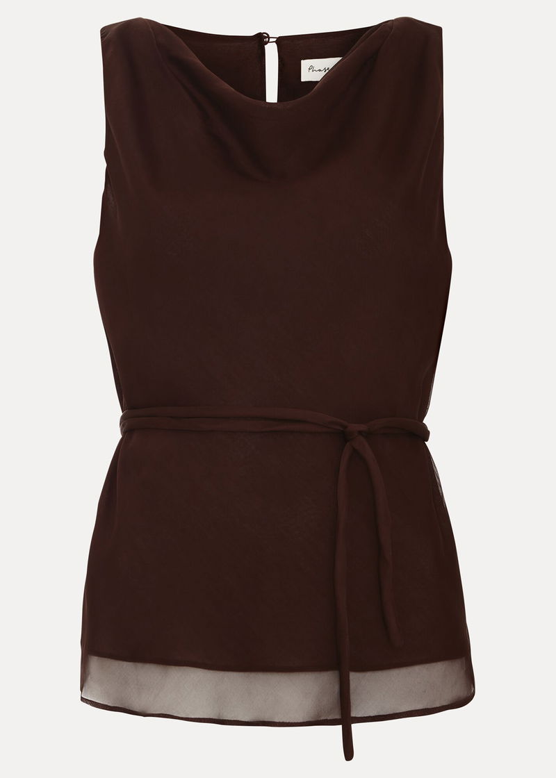 fit The luxe sleeveless top every wardrobe need for taking you from AM-PM. Designed in trending chocolate brown and made from 100% silk, this top is all about the modern touches. From the feminine cowl neck to the matching tie belt, this style can be worn for when the dress code is ‘jeans and a nice top’ or paired with skirts for a contemporary event look.