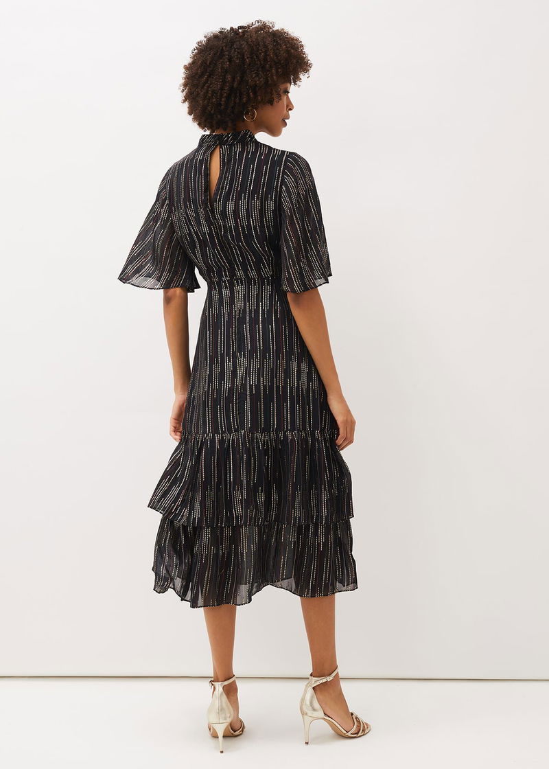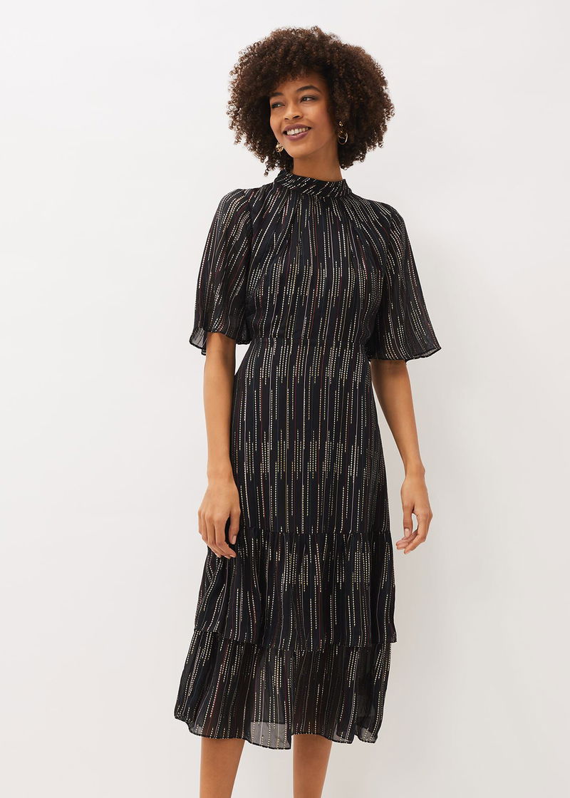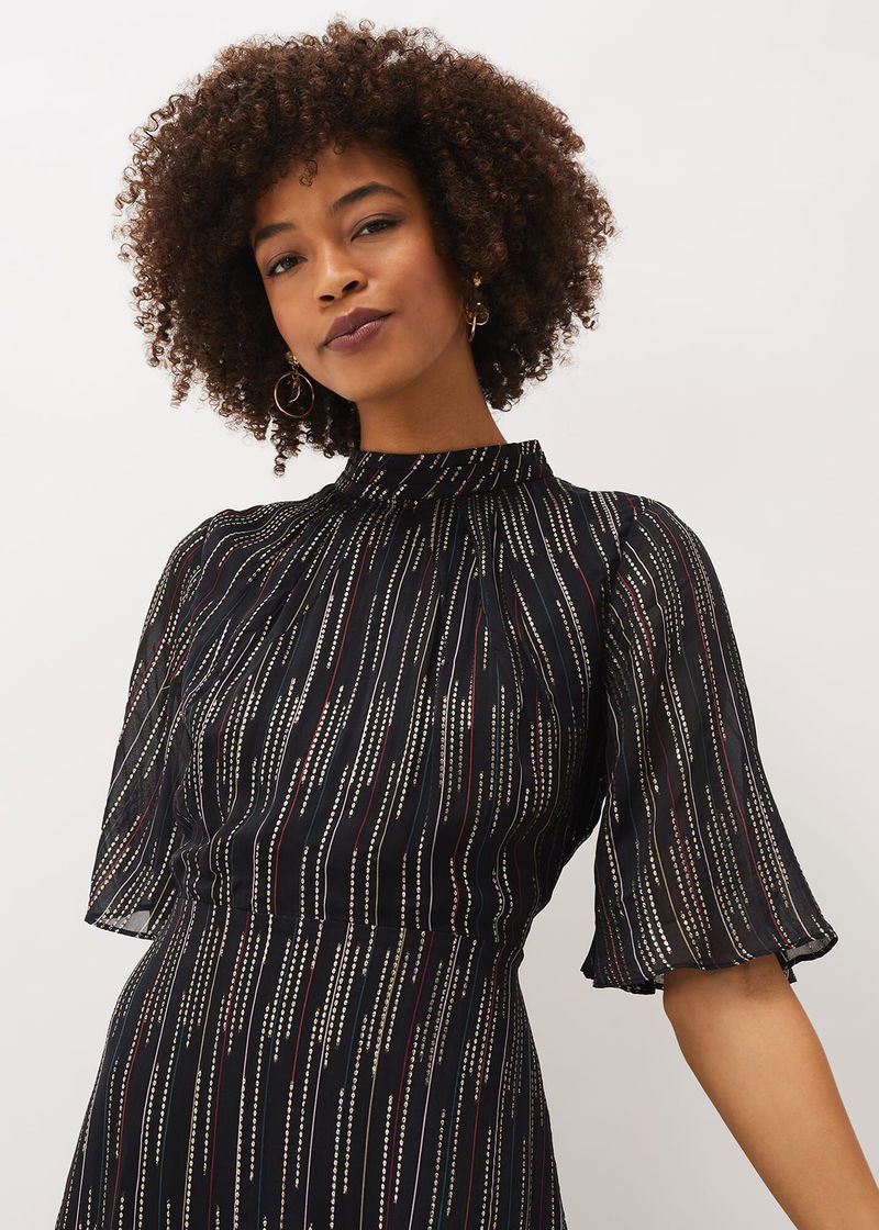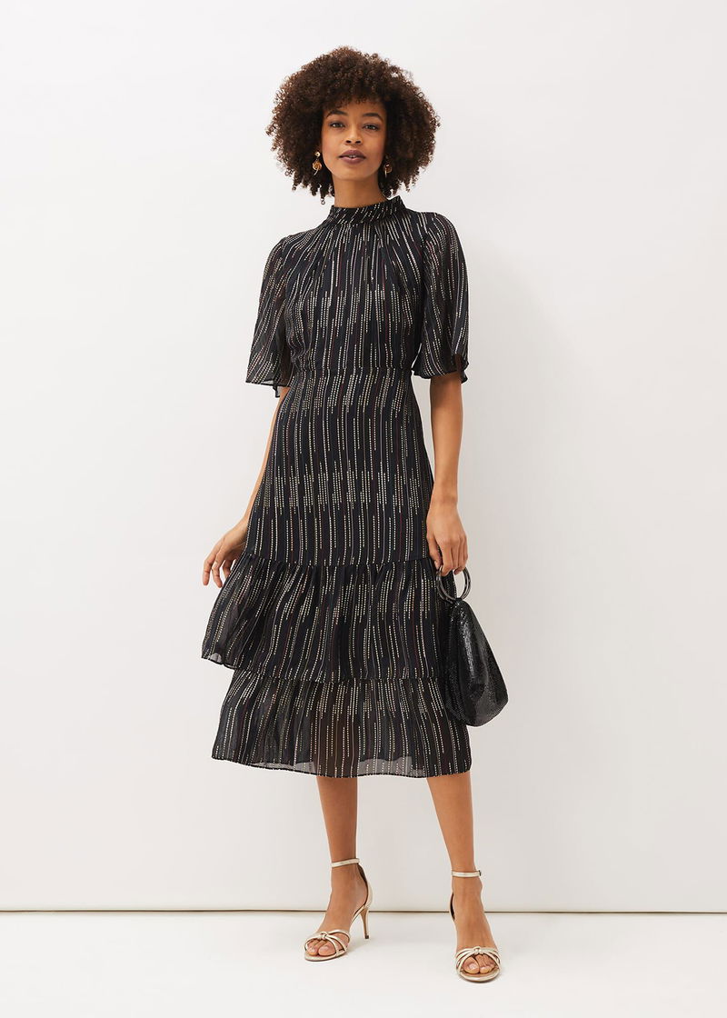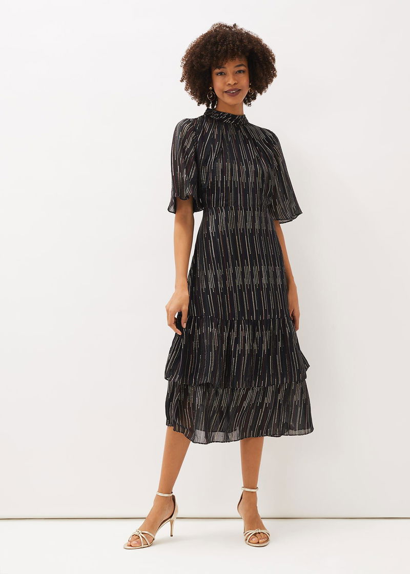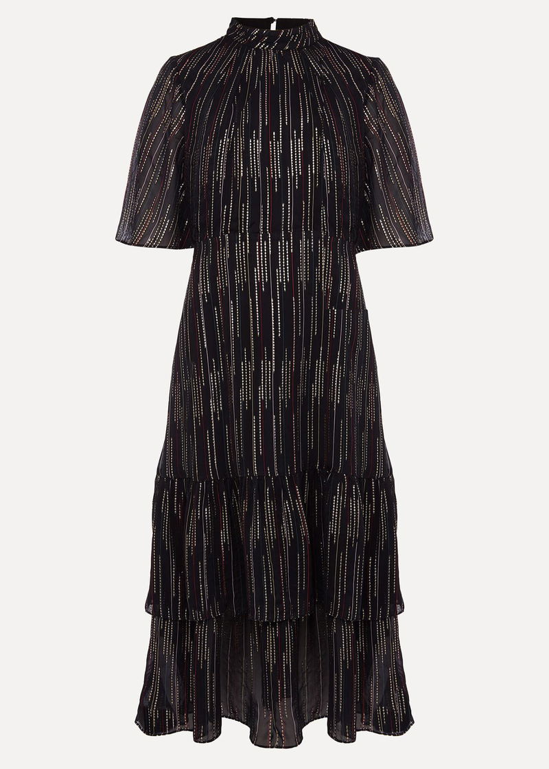 Need a standout festive style? Look no further than the Holly Dress. Designed with a metallic foil texture throughout, this party style features a tiered hem and feminine fluted sleeves for a romantic finish.