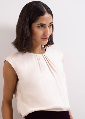 Contemporary and chic, this top is designed with directional design at the forefront. With a satin woven front and jersey back, it features a soft drape, which adds fluidity to the silhouette. Perfect for taking you from day to night, style with white jeans and matching sandals.