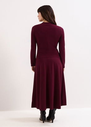 The ultimate 2-in-1 style. With a beautiful burgundy skirt designed in luxe woven satin, this versatile dress features a simple, sophisticated bodice with a detachable deep burgundy knit. The perfect style for transitional looks or taking you from sunny days to chilly nights.