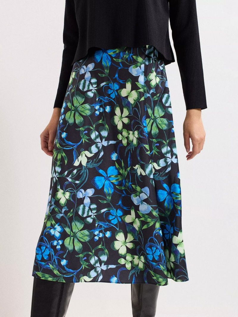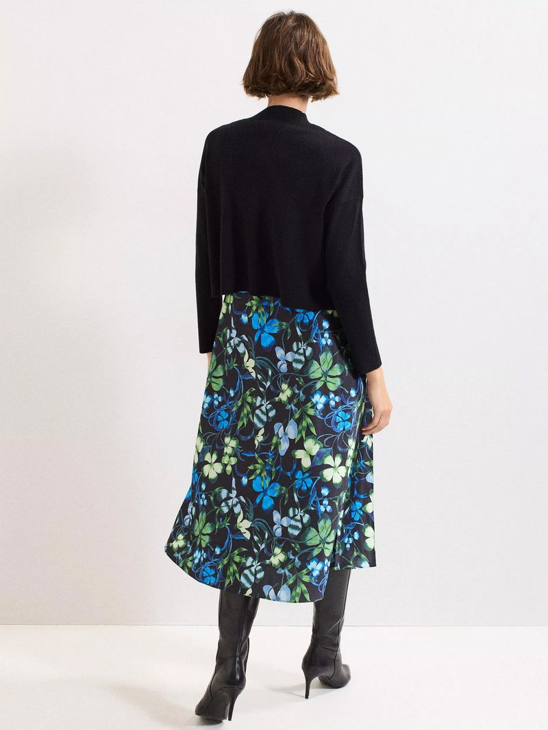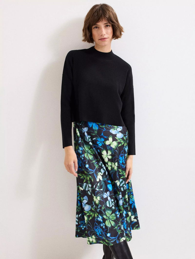 This versatile piece promises endless outfit opportunities. This midi dress features a layered top and a contrasting floral satin skirt for a contemporary update. Wear with the jumper or on its own paired with your favourite boots for a sophisticated, feminine style.