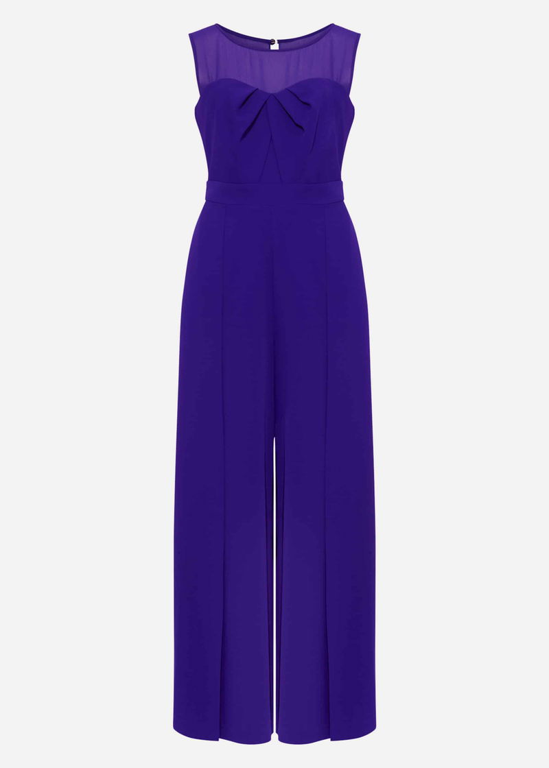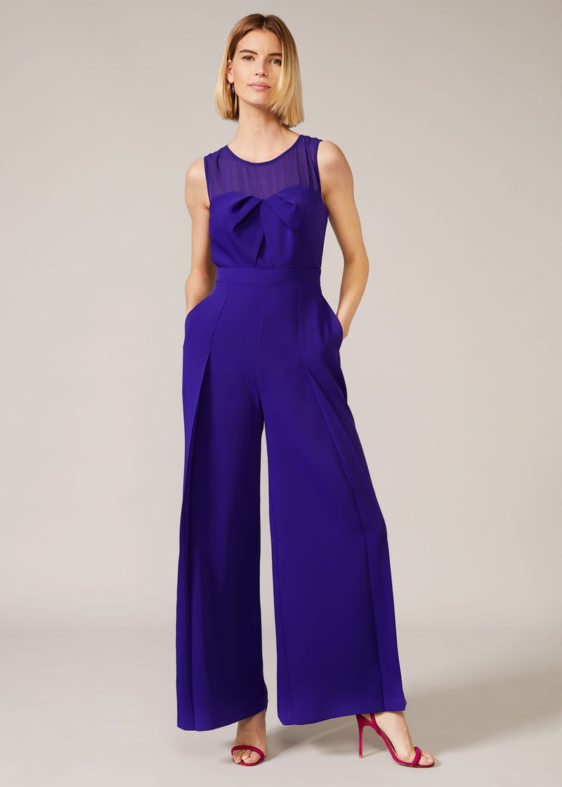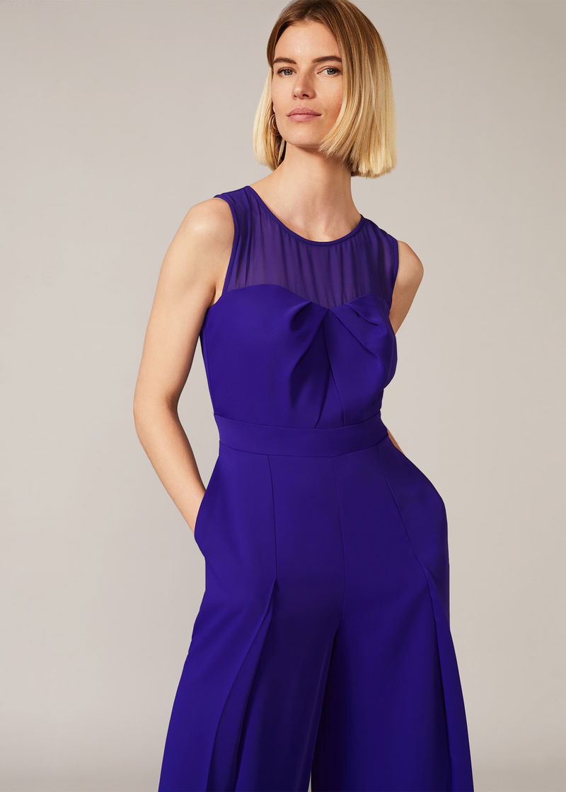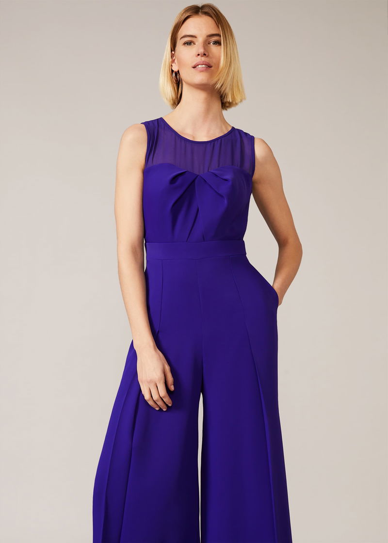 A party-ready look, our Jose Jumpsuit is designed in a vivid shade of electric blue that is sure to turn heads. This style is made to flatter with its pleated wide leg cut and twist detail on the bodice. The sweet heart neckine is framed by a sheer mesh panel and the look is finished with pockets and a key-hole back. In addition to parties, this jumpsuit would be a great choice to wear to the races.