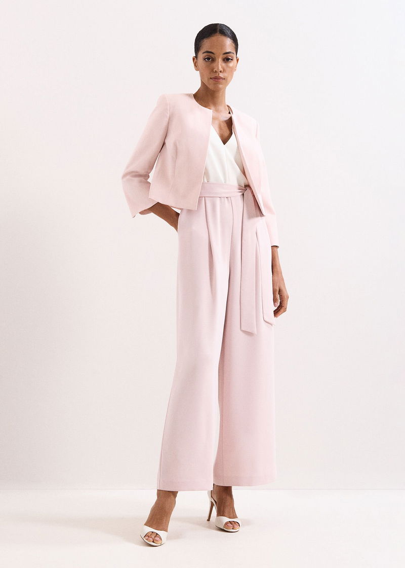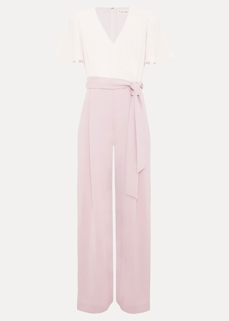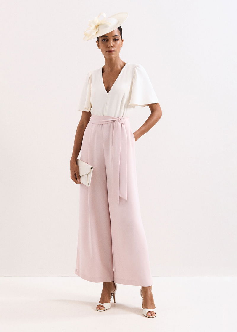 Loved by you, designed in a brand-new colour for the season ahead. In a beautiful pale pink shade, the Kallie jumpsuit features a modern wide leg silhouette, a feminine V neckline framed by romantic frill details and a matching tie waist belt to enhance the shape. Wear with heels and matching clutch to your next RSVP.
