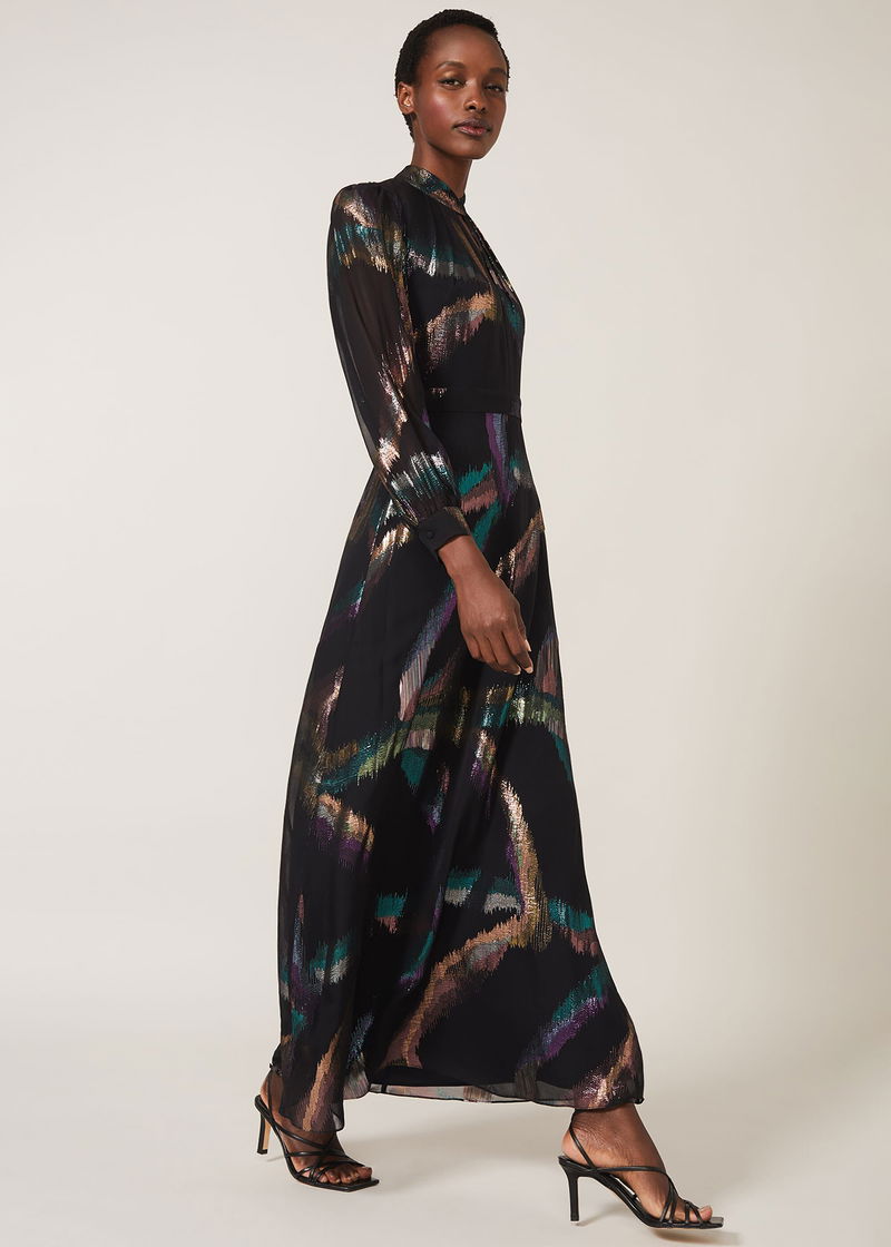 A striking occasion piece to add to your must-wear list, our Kaylani Dress is designed in a silk-rich blend with a metallic brushstroke jacquard print that catches the light with every twist and turn. A high neckline, sheer blouson sleeves and keyhole cut-out on the bodice add the statement finishing touches to this style.