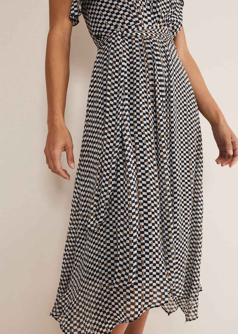 A classic checked style to add to your dress rotation. Designed with a one shoulder, our on-trend check dress features frill detailing and a flowing high low skirt. Dress up with black heels or down with boots.