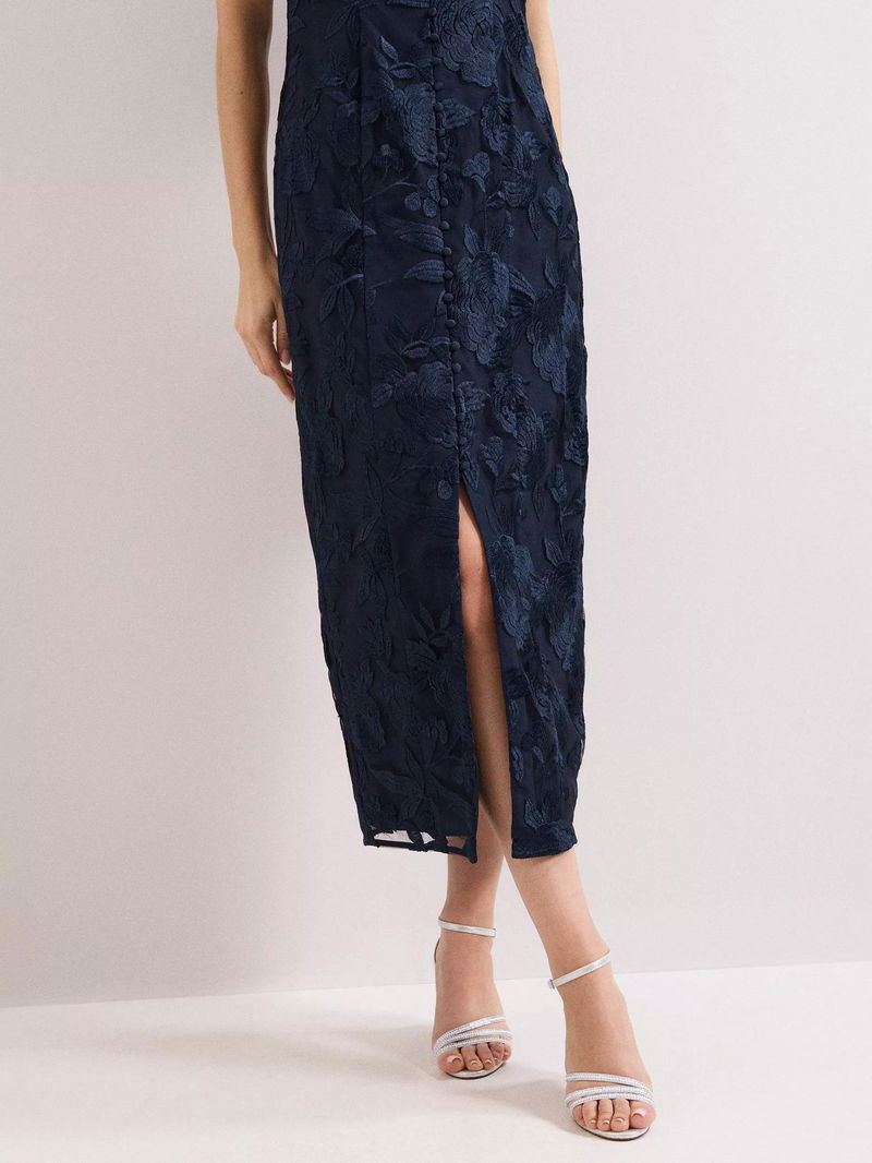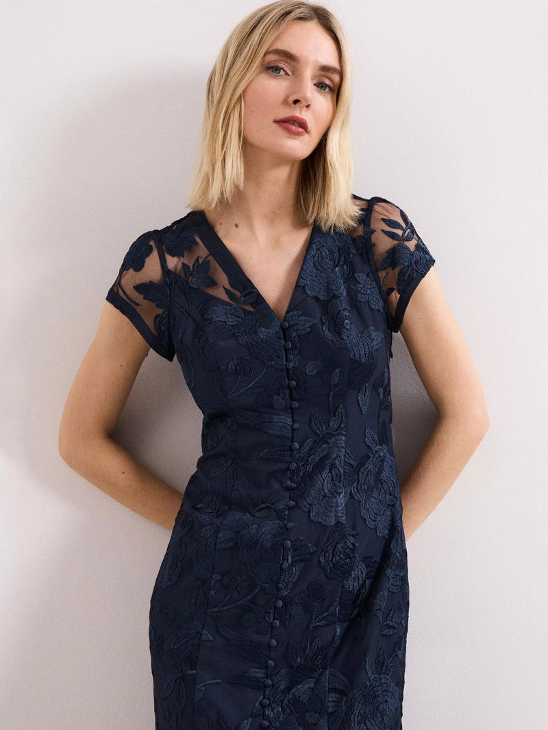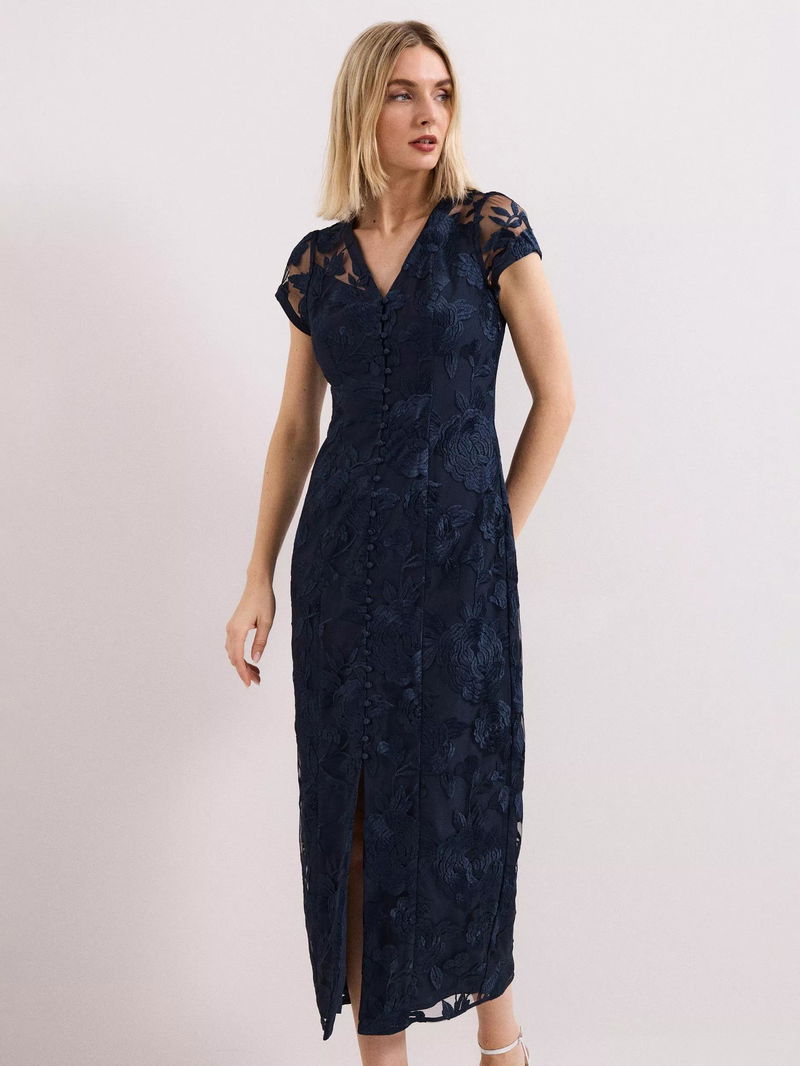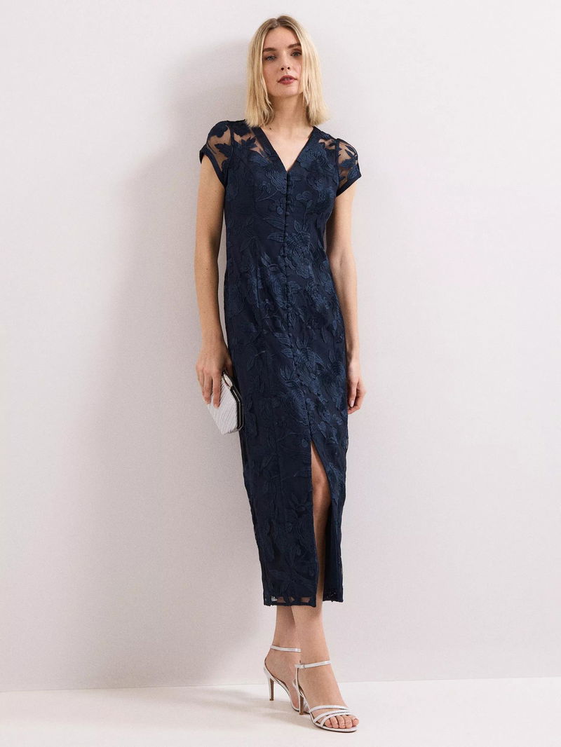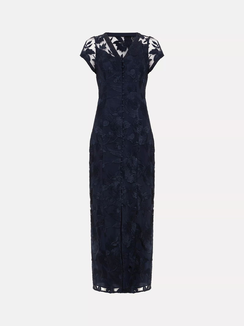 A Phase Eight maxi dress. Its elegant sheath silhouette and delicate lace embroidered details give you versatile confidence for party or evening plans. The cap sleeves and V-neck flatter, ensuring you stand out and feel your best.