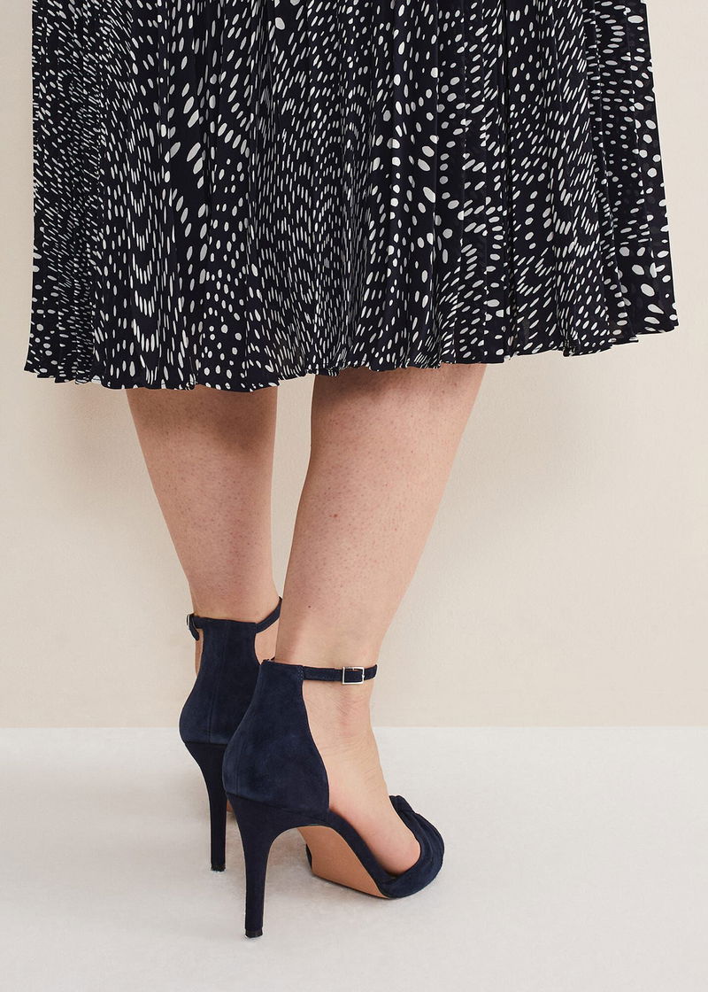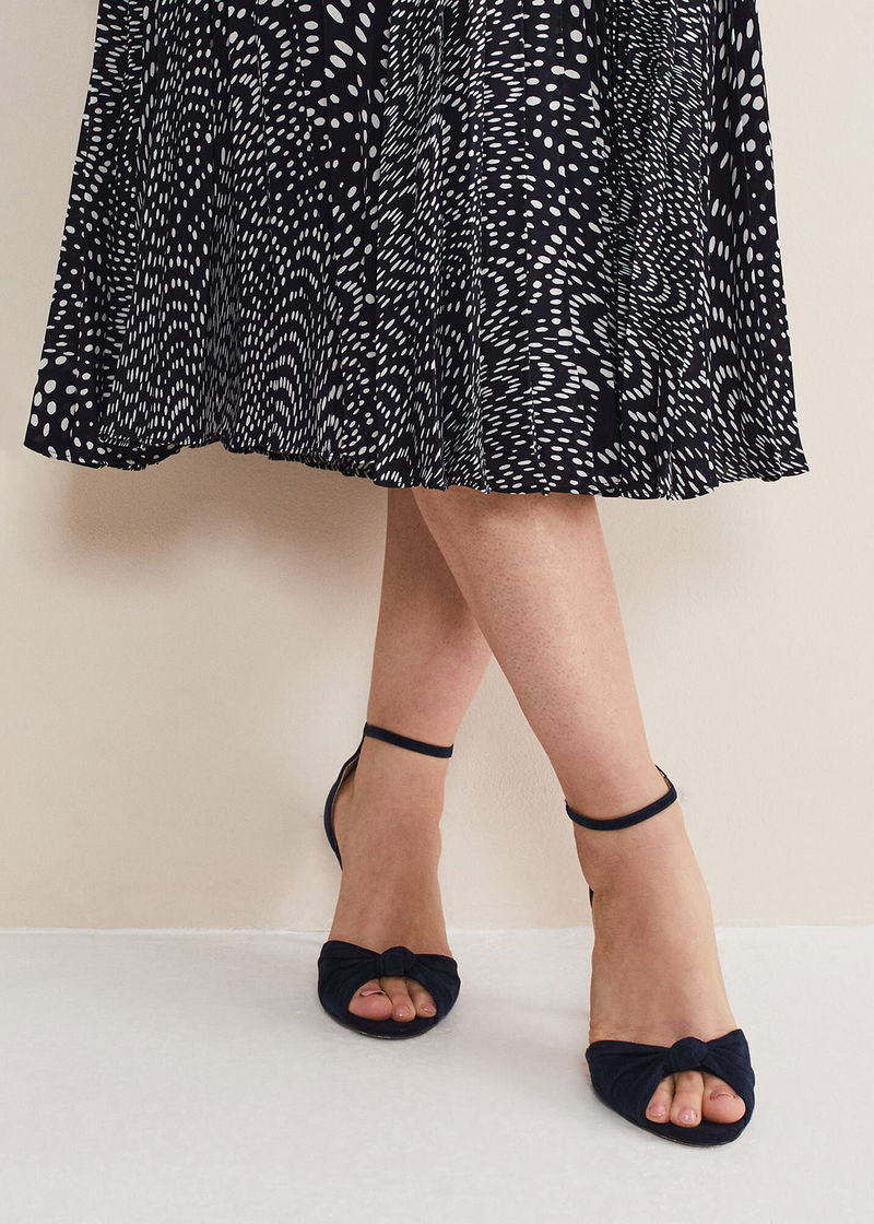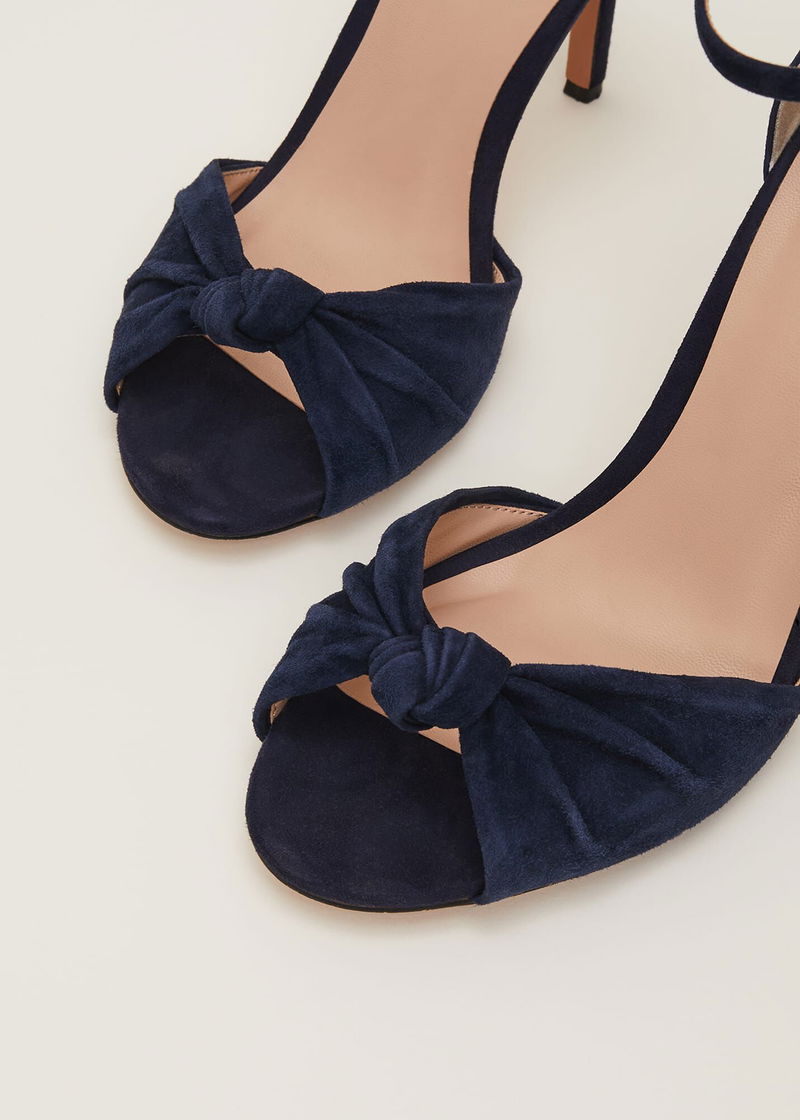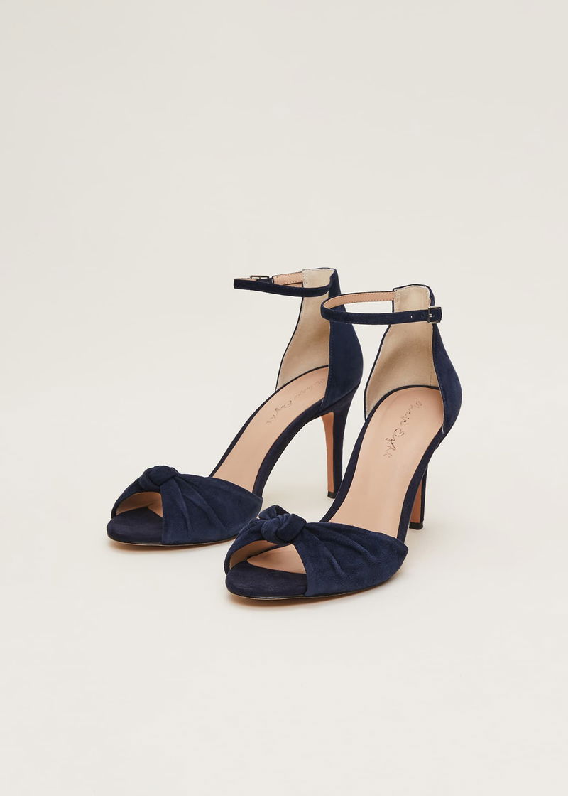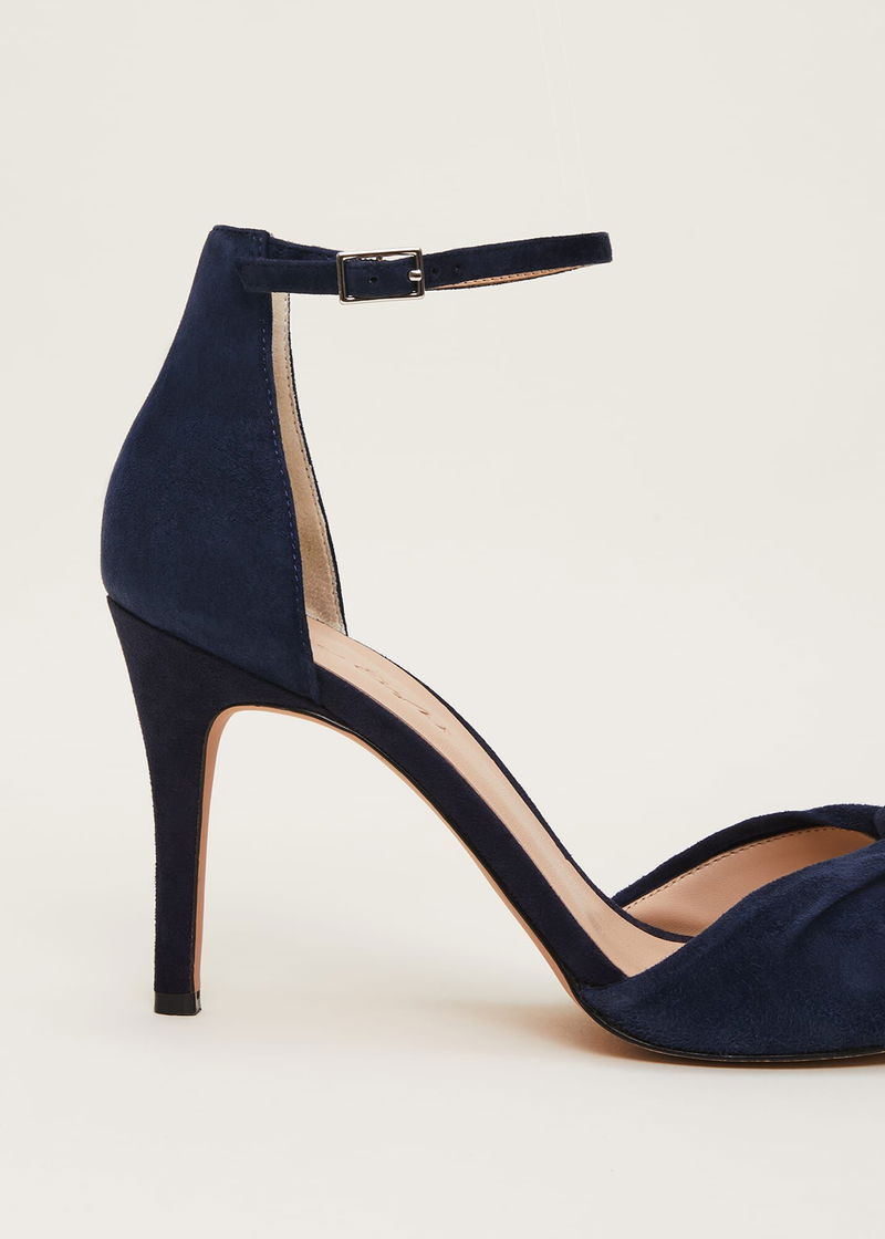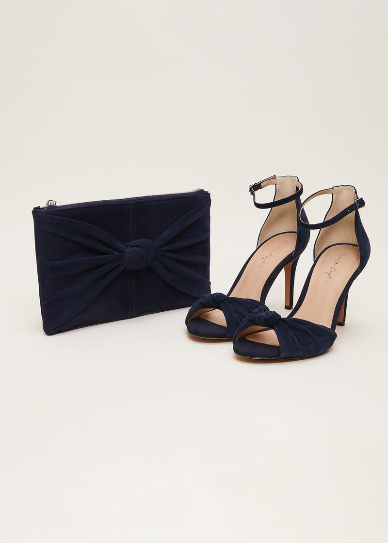 A perfect choice for any special occasion. Our elegant navy heels feature delicate ankle straps and knot detailing at the peeptoe. Style with the matching clutch.