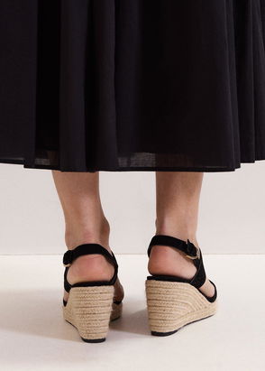 Designed with both style and comfort in mind, our black espadrilles have a jute wedge sole and 100% leather straps with buckle fastening at the ankle strap and cross over detailing at the round open toe. These are perfect to wear with everything from tailored trousers to maxi dresses.