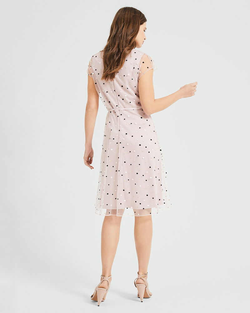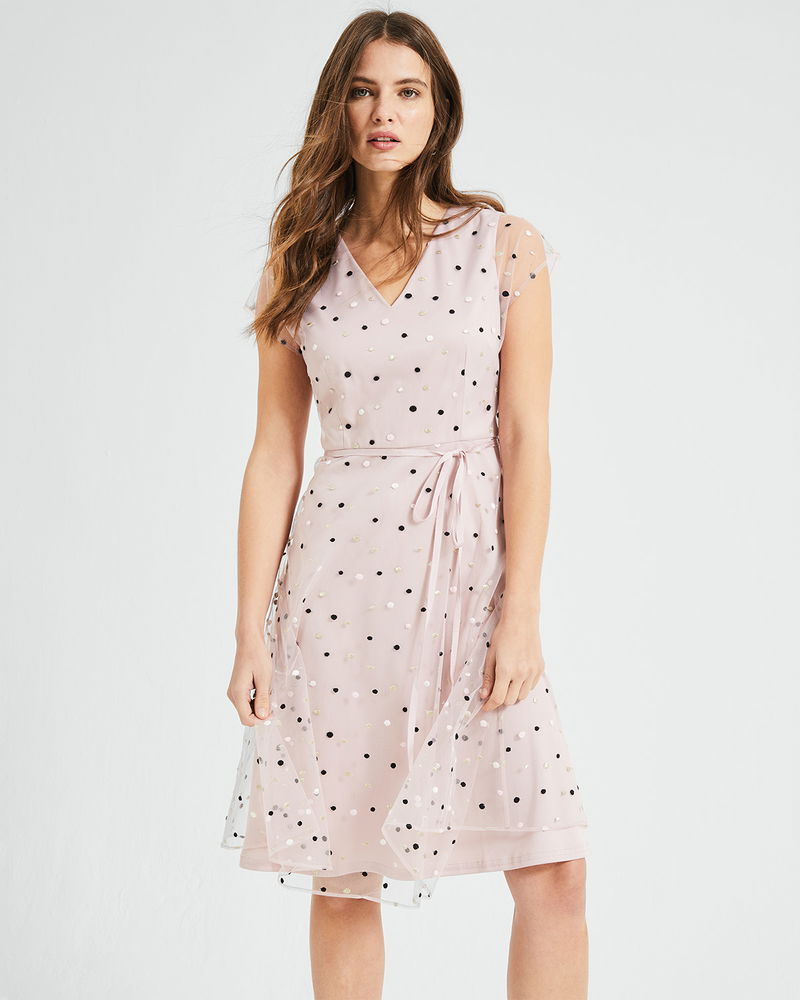 A pretty party and occasion dress designed in a fit and flare shape, and enhanced with a thin waistband. This style features a tulle overlay with on-trend mixed spot embroidery, and is finished with cap sleeves, a V-neckline and a zip fastening. This dress falls below the knee.