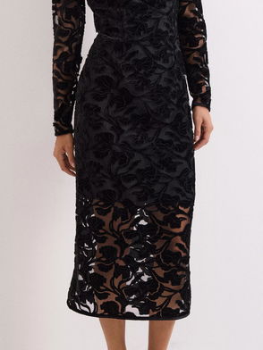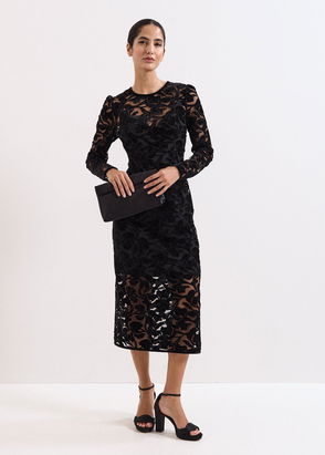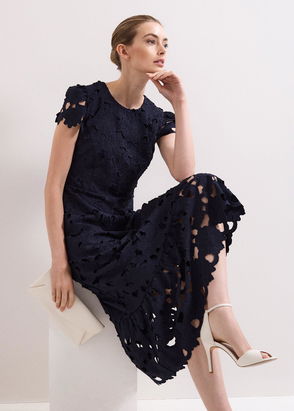 A timeless style for your next occasion. Created in an elegant guipure lace with a modern peplum hem and semi-sheer puff sleeves, this occasion dress is a stunning style you'll wear season after season.
