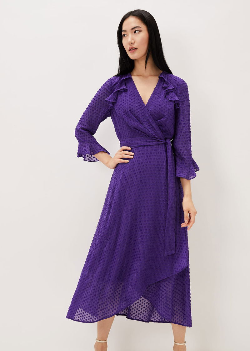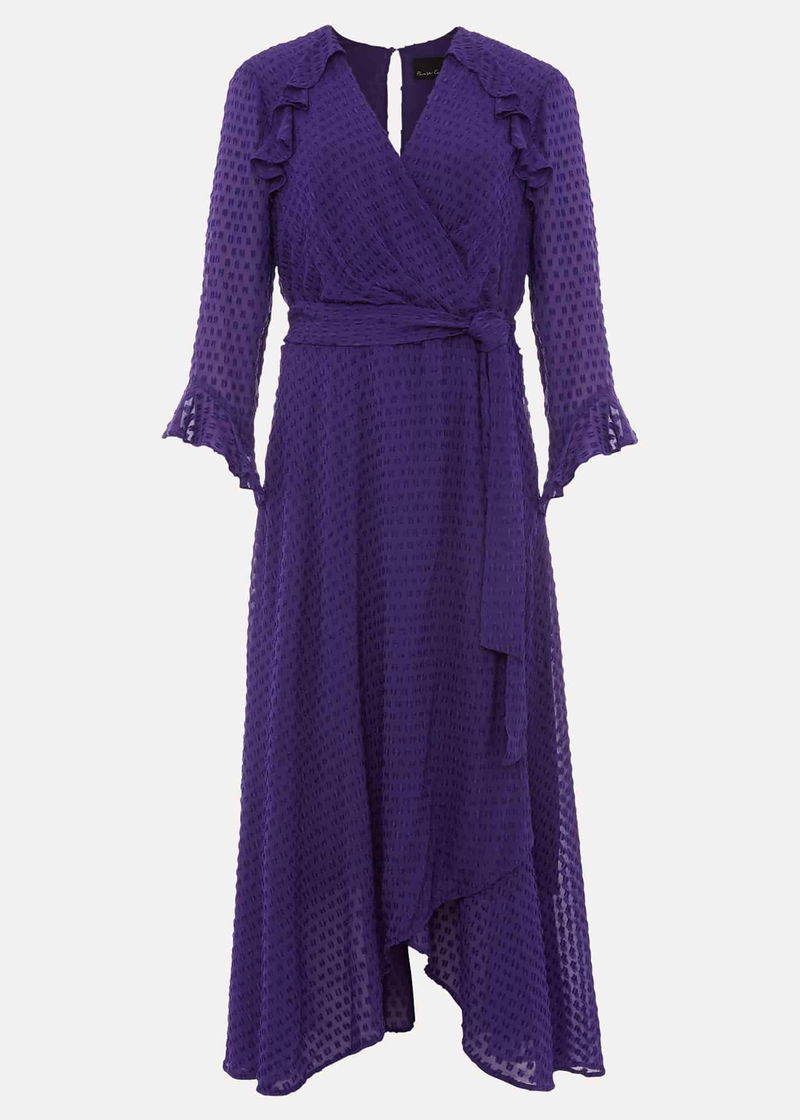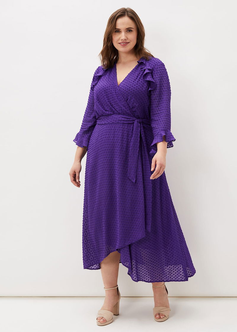 A trend-led occasion style that'll work for all your upcoming events, this flocked spot dress features 3/4 fluted sleeves and a flattering wrap design. We'll be wearing this to all of our garden parties and special occasions.