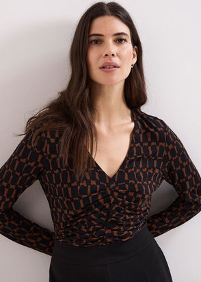 Make a style statement. Designed with an orange and pink geometric print, the Loicia top features a wrap around bodice, textured detailing on the shoulders and a feminine V-neckline. Wear with white trousers and wedge sandals for the perfect look.