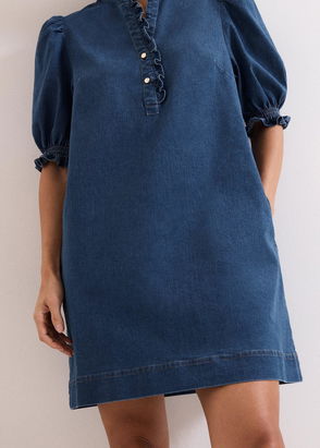 This denim-look midi dress is the perfect balance between soft and structured. Designed with pockets and contrast stitching, this dress features a modern A-line skirt, which is pulled together with a tie belt for added shape and fluidity. We style ours with trainers or sandals for an elevated look.