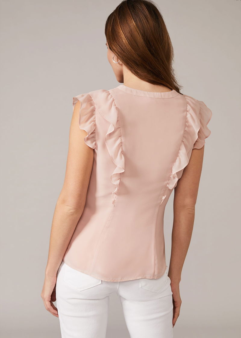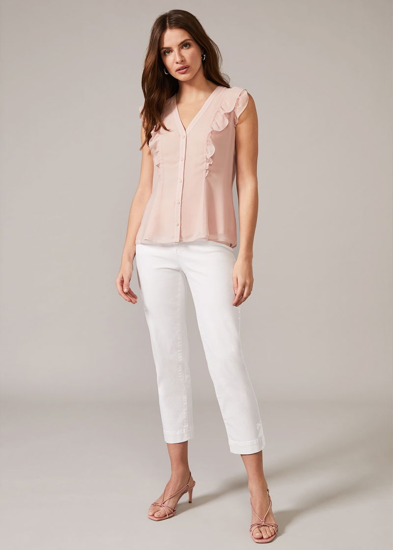 A smart separate to add to your spring/summer wardrobe. This sleeveless V-neck blouse is designed with feminine ruffle detailing and flattering seams for shaping. We've styled ours with cropped white jeans and heeled sandals.
