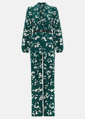 A pop of vibrant green for confident dressing. This jumpsuit features modern design details such as voluminous puff sleeves and concealed pockets. Pleating subtly tailors the wide leg silhouette, ideal for an effortless day or night look.