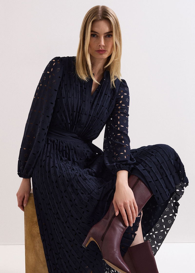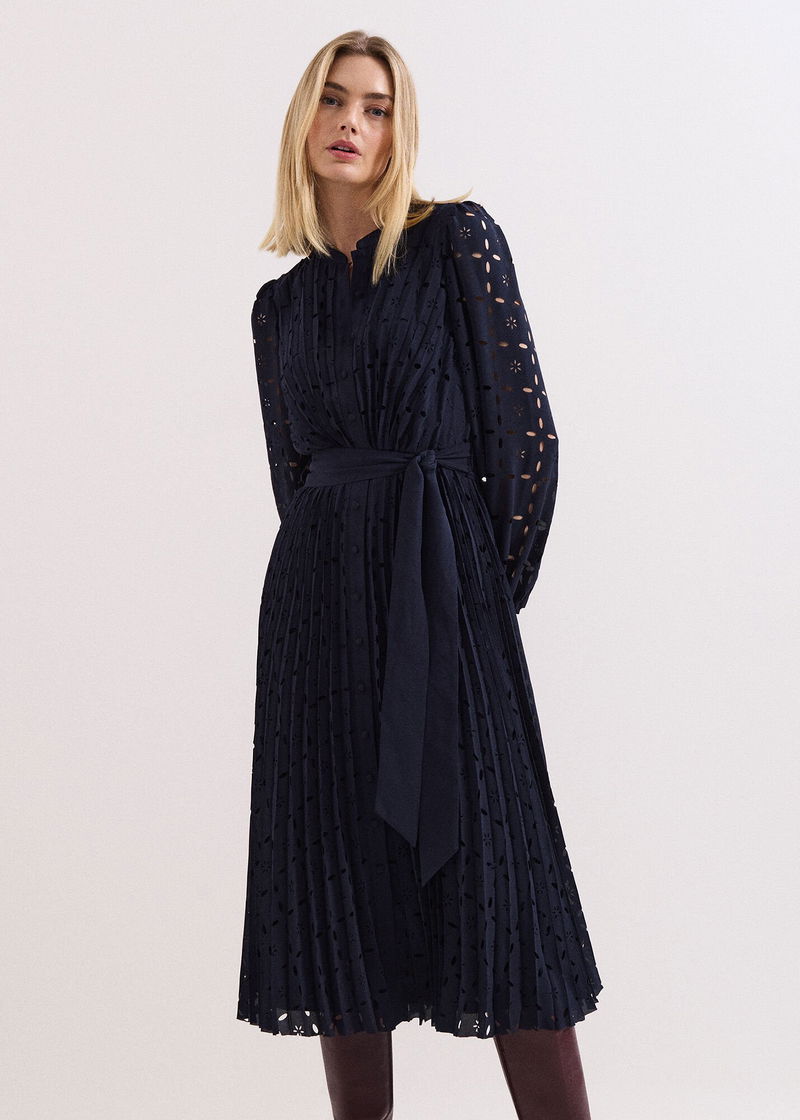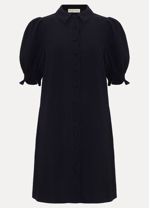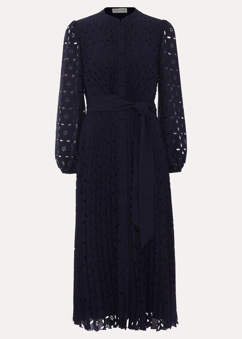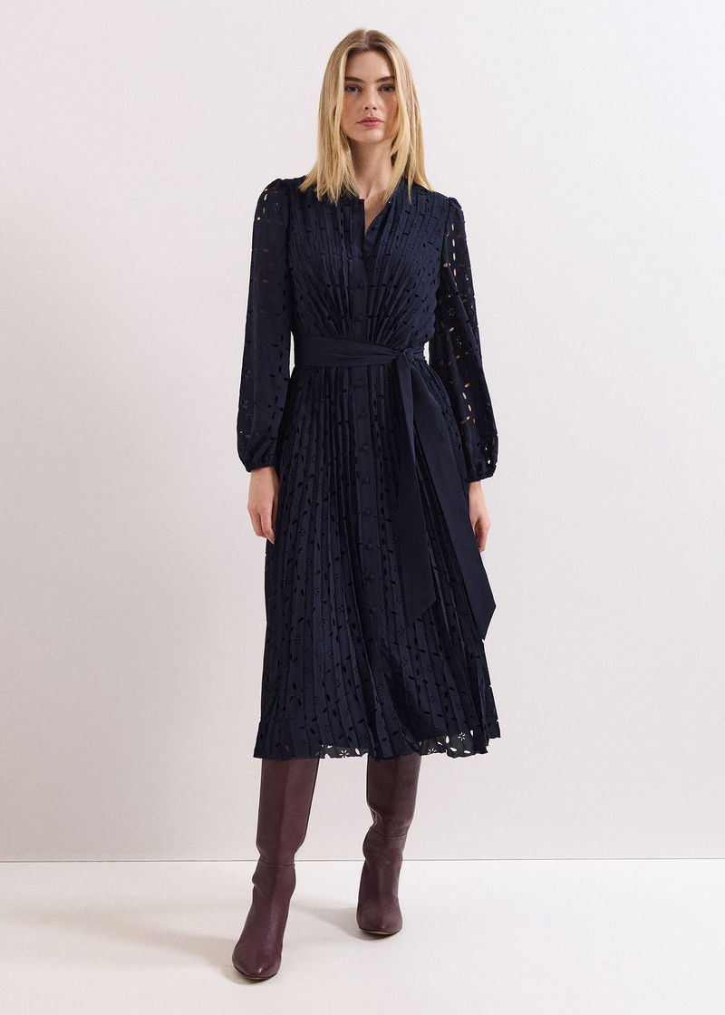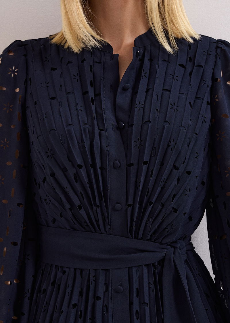 fit Timeless with a modern edge, meet the Marina dress. In a rich navy shade, this midi shirt dress is designed with sharp pleating that adds movement to the silhouette. With contemporary design details such as the cutout fabric, subtle blouson sleeves and matching tie belt, this dress is perfect for both everyday style and special occasions.