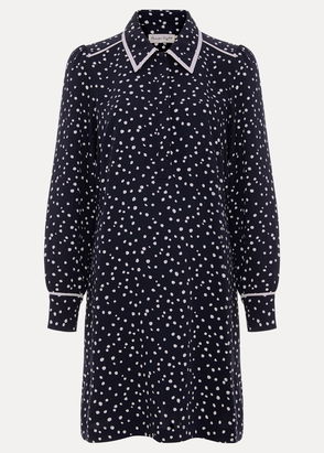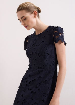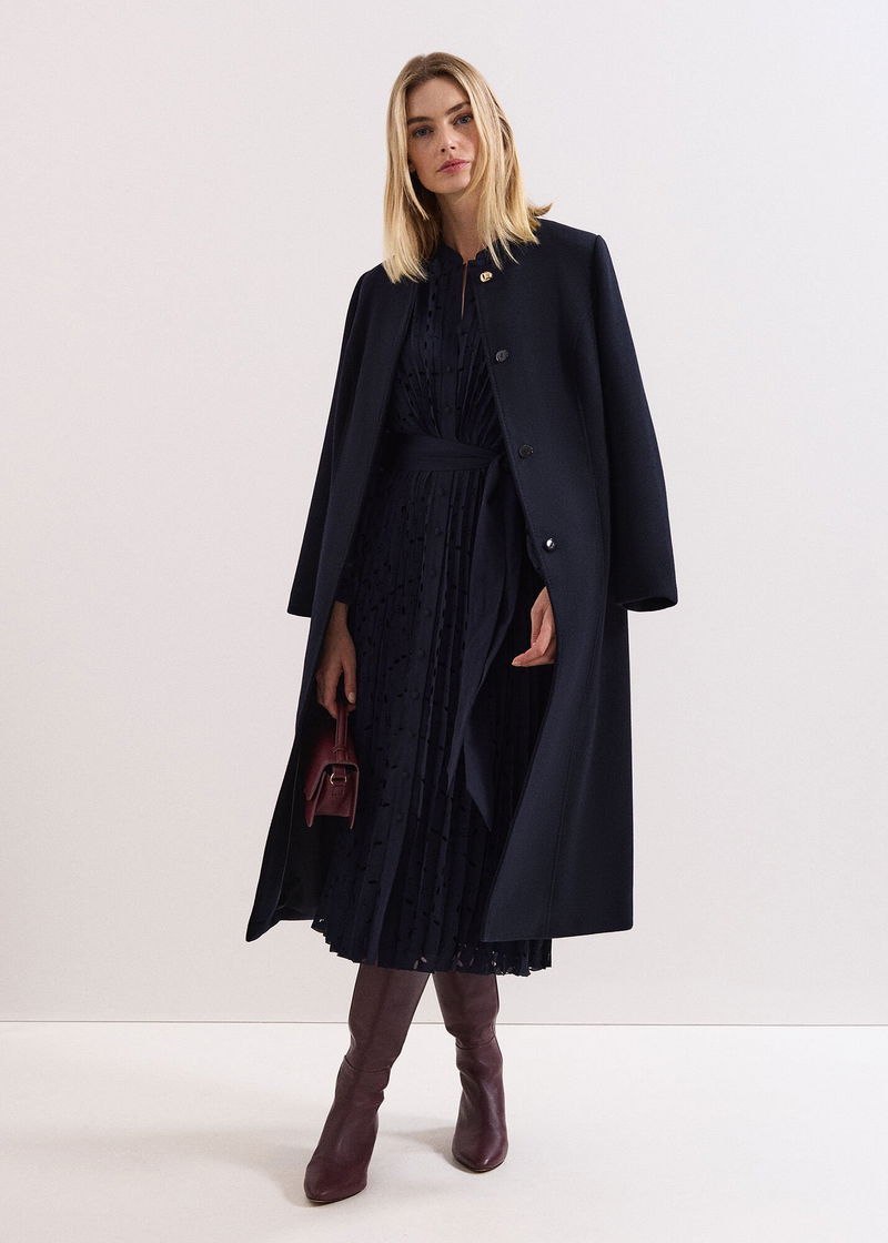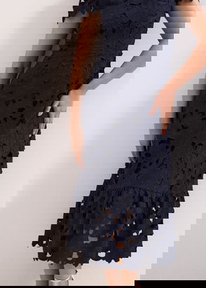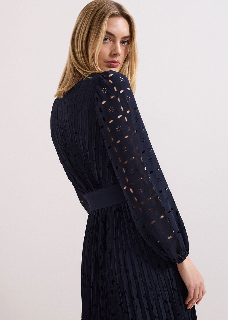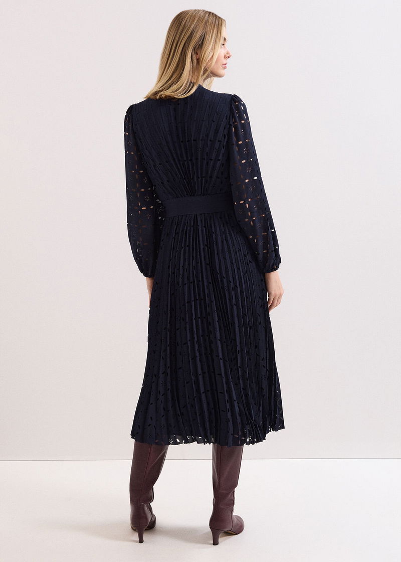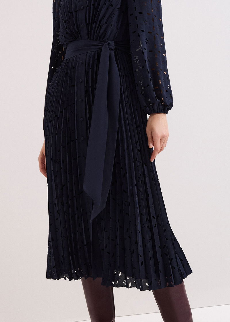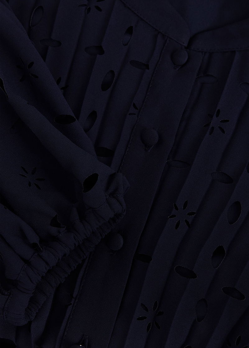fit Timeless with a modern edge, meet the Marina dress. In a rich navy shade, this midi shirt dress is designed with sharp pleating that adds movement to the silhouette. With contemporary design details such as the cutout fabric, subtle blouson sleeves and matching tie belt, this dress is perfect for both everyday style and special occasions.