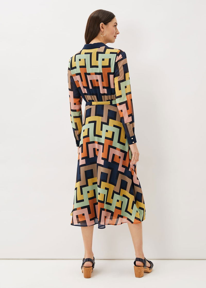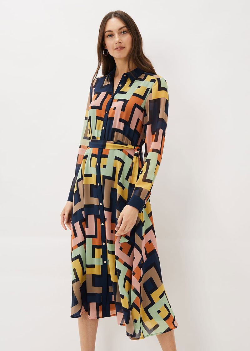 Make a statement in the Milano shirt dress, the perfect do-it-all dress. Designed in an eye-catching, bold geometric print, this shirt dress features a collared neckline and decorative gold buttons as well as a self-tie belt to cinch in your waist. It's a flattering style that's perfect to pair with black clog sandals and simple accessories.