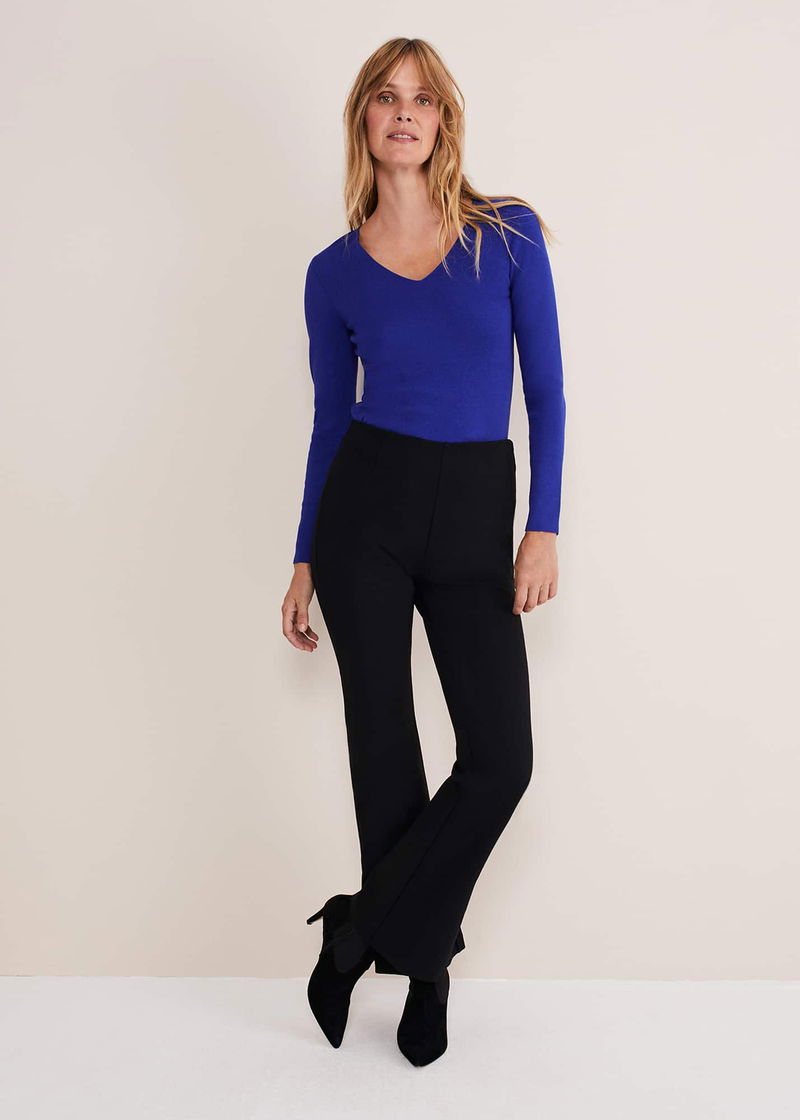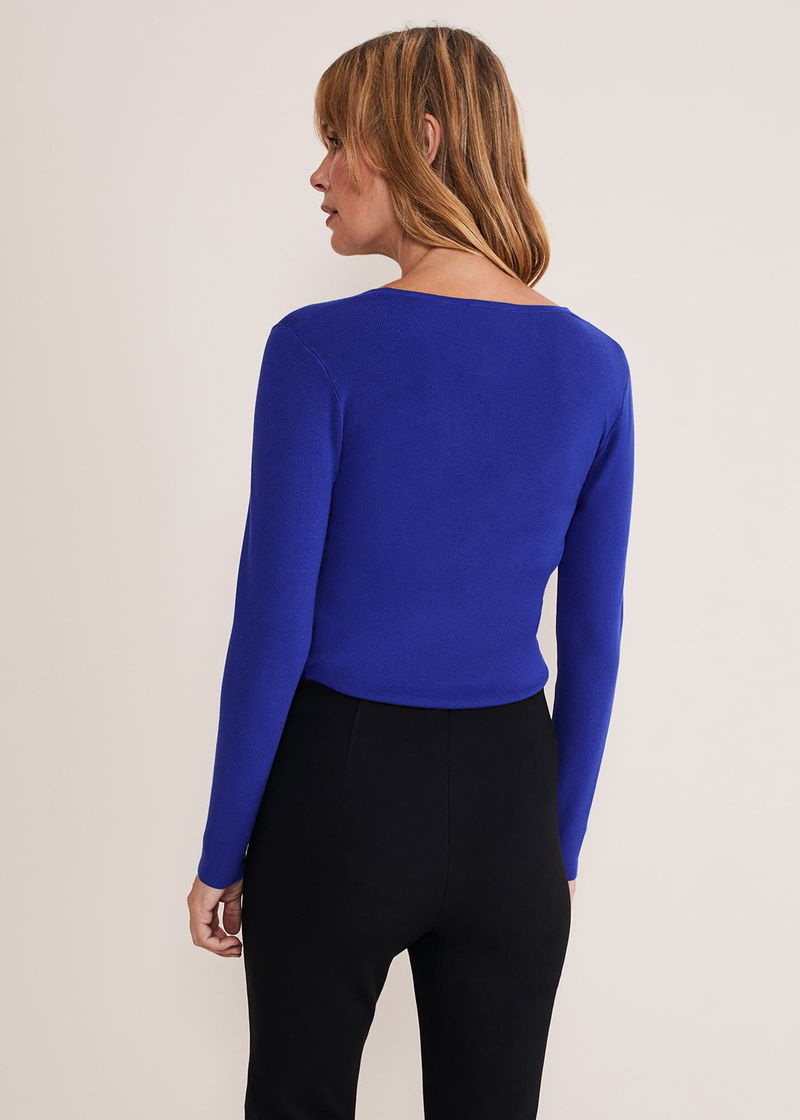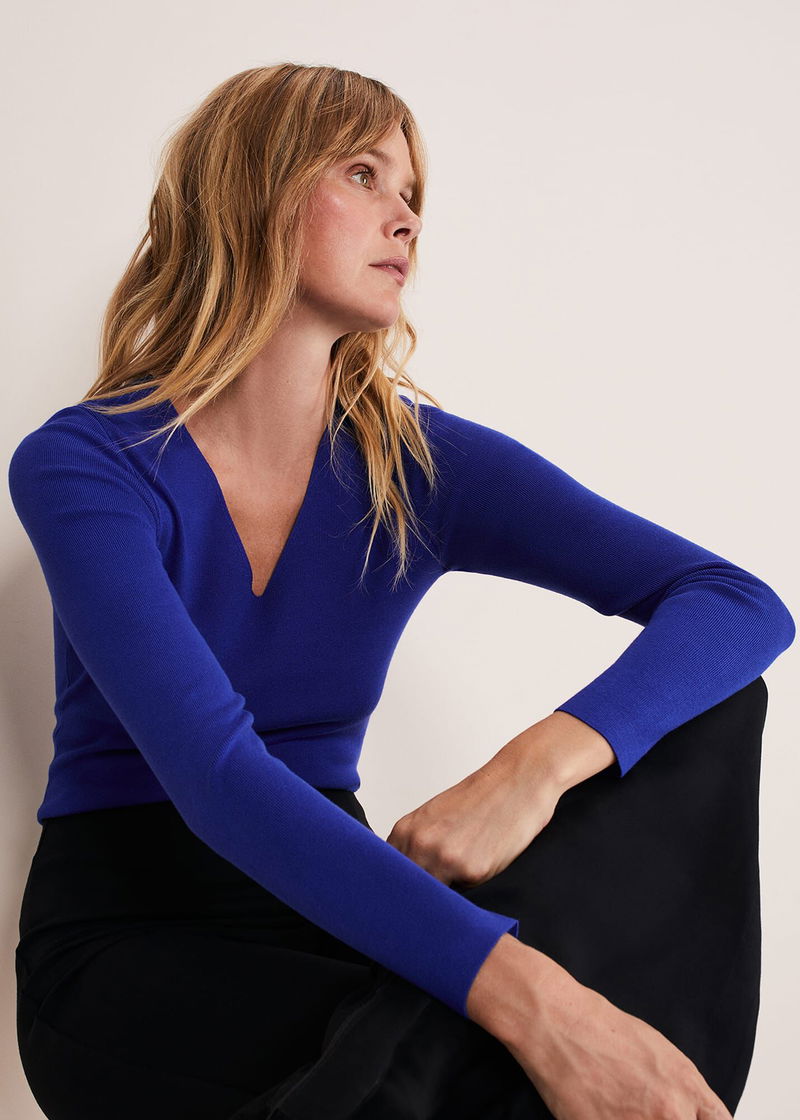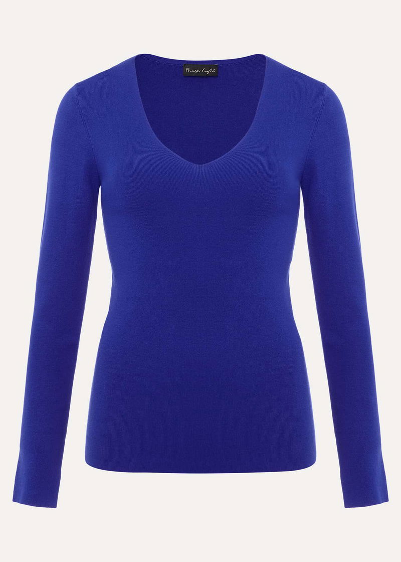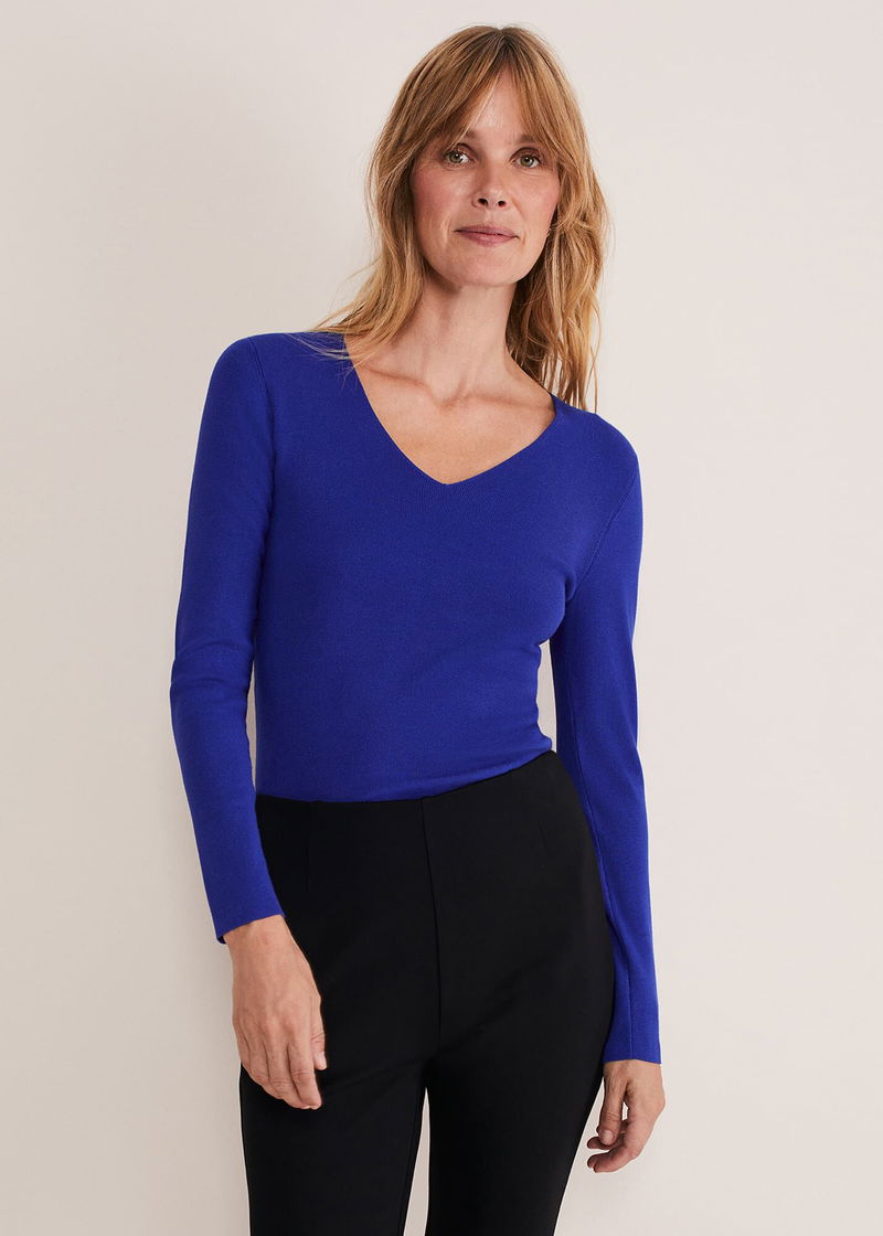 The staple knit your wardrobe needs. Designed in a timeless blue shade with a feminine V-neckline and full length sleeves, our top is perfectly paired with any of your separates. Style with jeans and white trainers for a classic, everyday look.