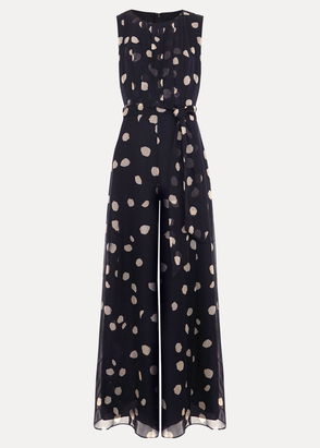 Meet your new go-to jumpsuit. Designed with a pleated wide-leg and spotted wrap-around bodice, our Molli jumpsuit is the perfect dress alternative to wear to your future RSVPs. Style with metallic accessories for the perfect event-ready look.