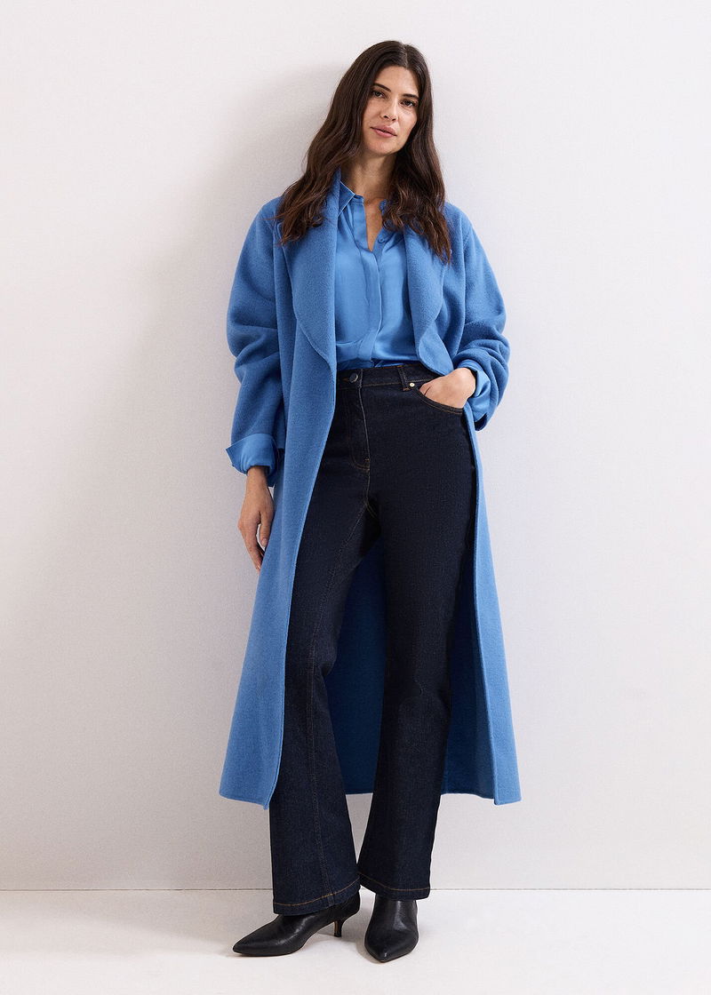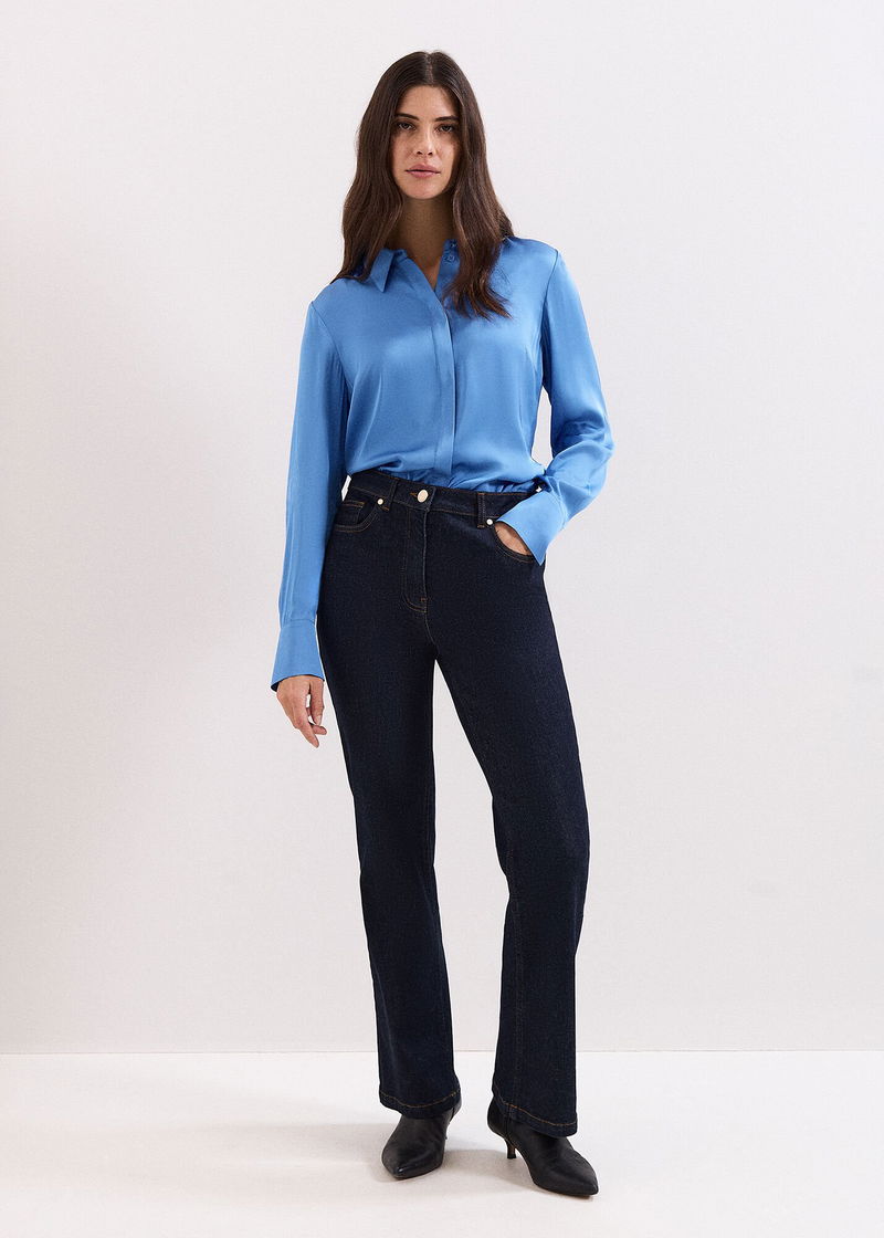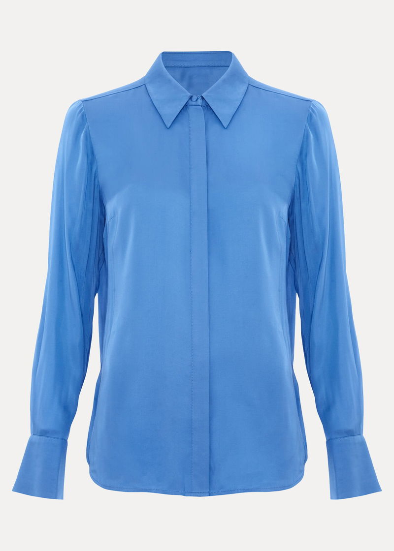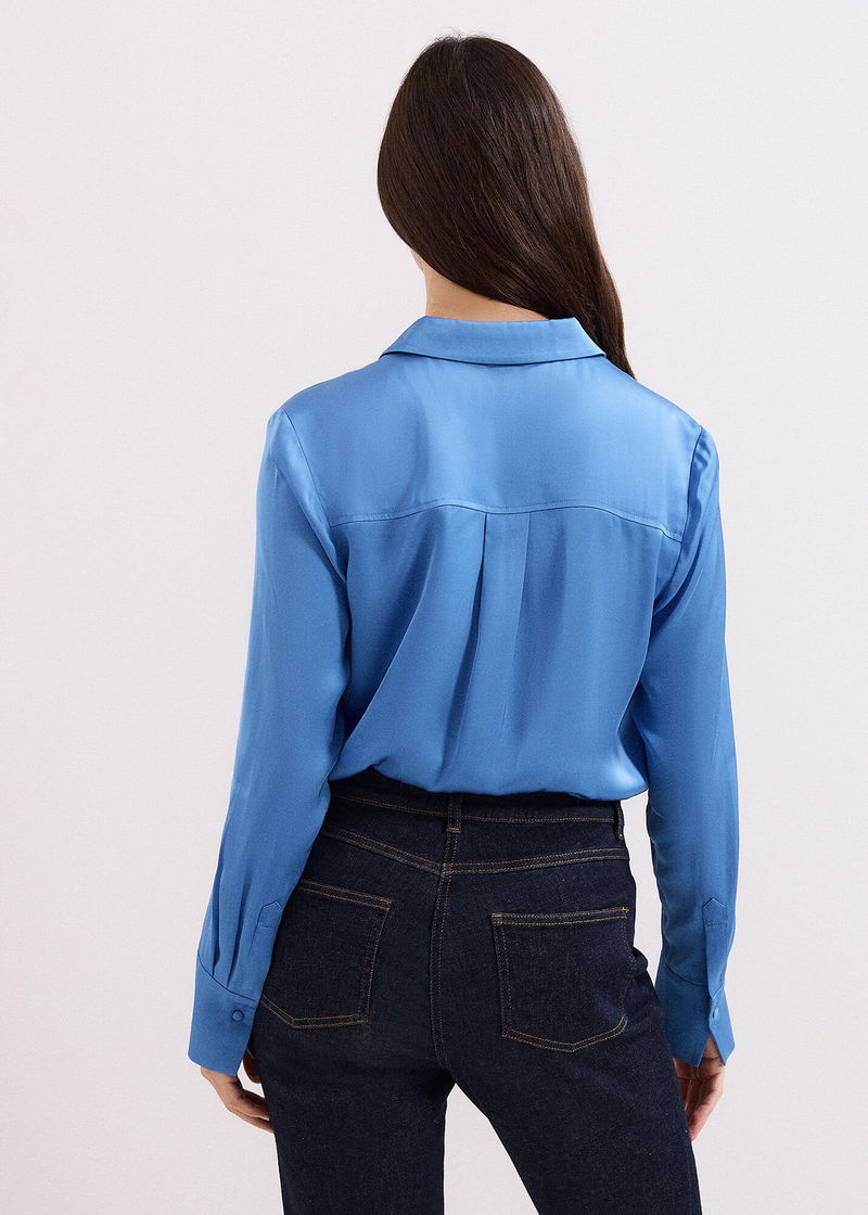 This blue satin shirt is a premium wardrobe staple. Cut from smooth satin for a luxe feel, the sleeves are punctuated with subtle ruching and contemporary, oversized cuffs. Go for a full tonal look and style with matching navy styles or add tailored black trousers for a pared back look.
