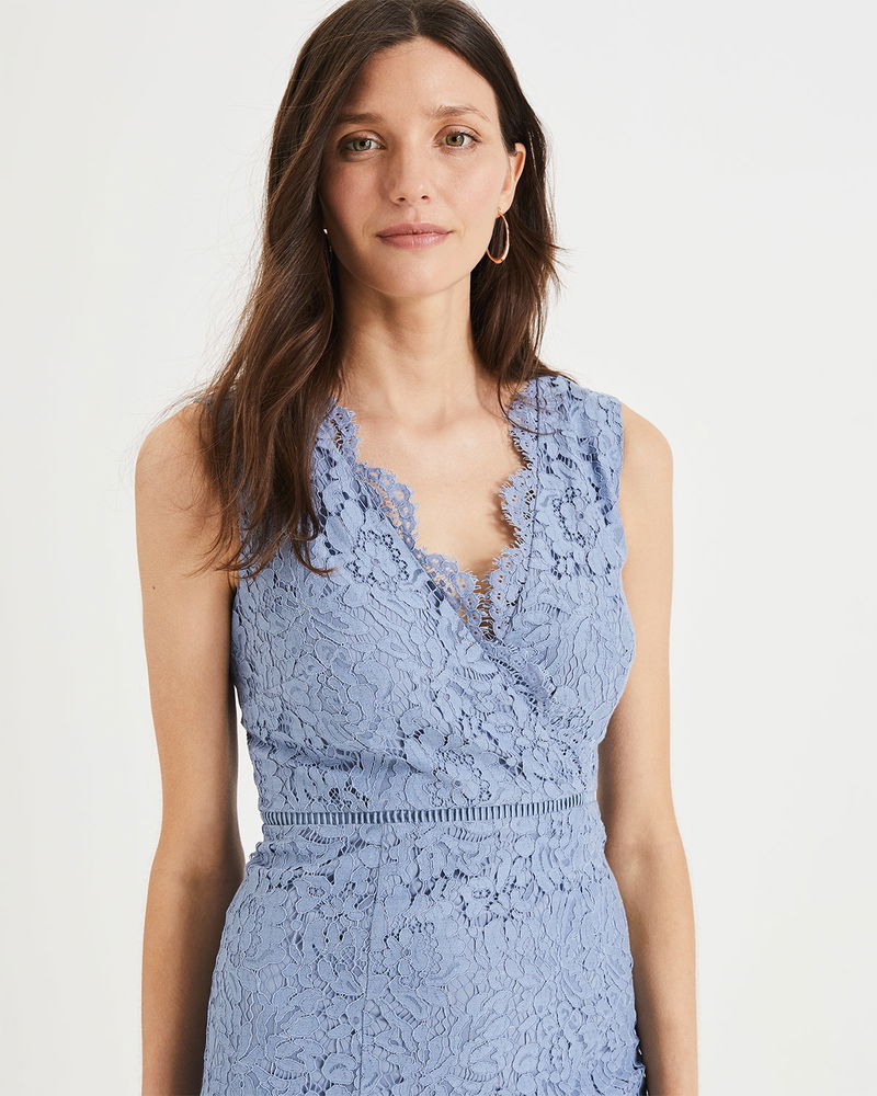 This stunning lace bridesmaid dress has a fitted silhouette with an elegant fishtail hem, plus a flattering faux-wrap bodice. This dress, which would also make a stunning party, prom or occasion style, is fully lined and completed with ladder stitch detailing at the waist, and a romantic scallop lace V-neckline.