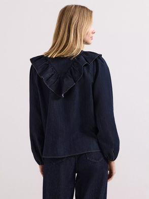 Refresh your transeasonal styling with this denim blouse. With stitch detailing, the Penelope blouse is finished with a pussybow neckline that offers a vintage-inspired aesthetic. Style with jeans and boots for an effortless double denim look.