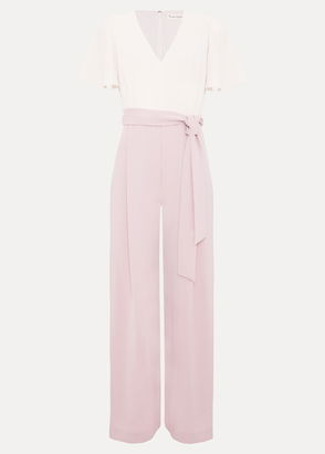 From our Petite Collection. A timeless jumpsuit made for your upcoming events. Designed with a white top that features a feminine V-neckline that's framed by frill detailing and falls to a navy wide leg silhouette. Wear with heels and a matching clutch.